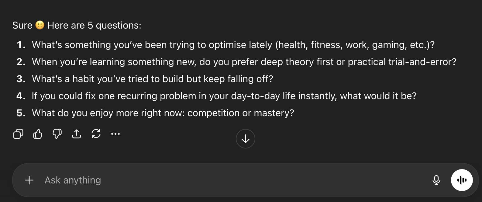 This is something we found was a problem with the question-asking tool. The tool definition and system prompt didn’t seem to be enough.