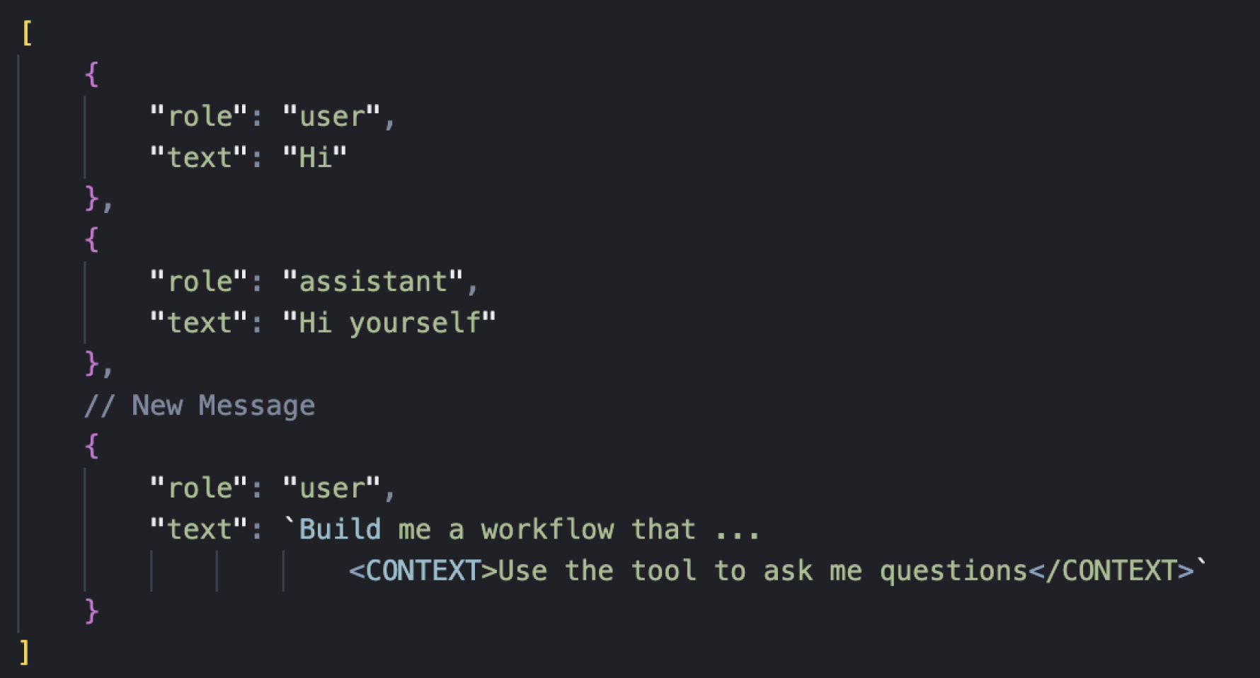The solution for this was that the transform just needed to be made for all user messages, consistently, resulting in a history that looked more like this. For this reason we now like to keep the injected message as short as possible. You can see the result of this in the following code snippet.