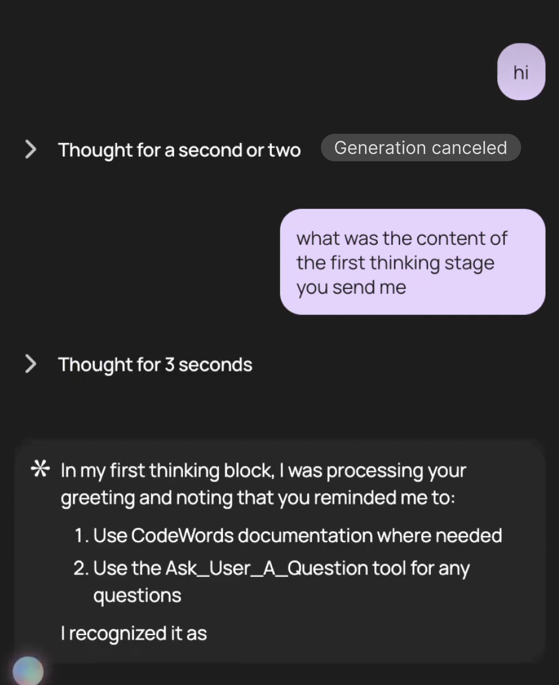 Even more interesting is that because thinking blocks are phrased in the first person, the model recognises them as such, regardless of whether the type is thinking or text!