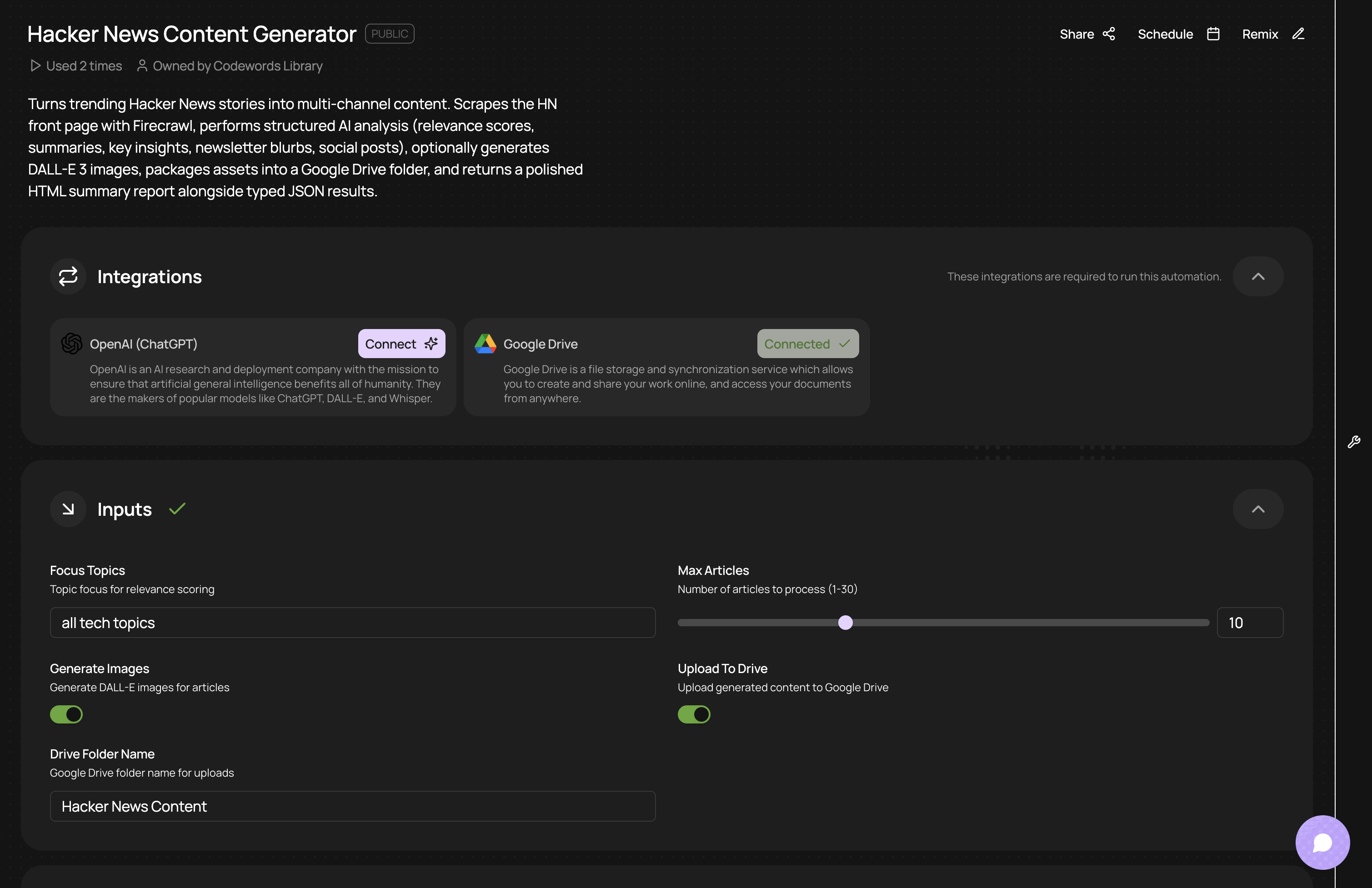 Input: Focus topics, number of articles to analyze, image generation, include uploads to Google Drive.
