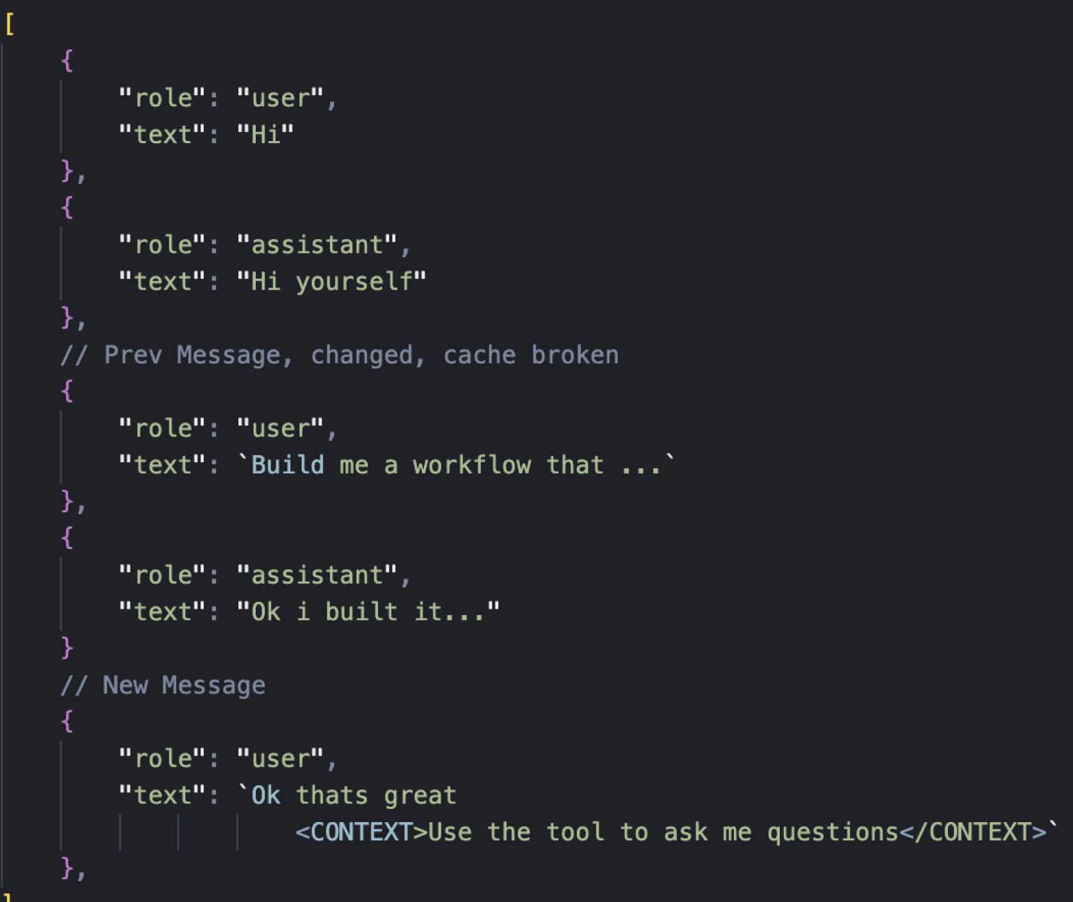 The solution for this was that the transform just needed to be made for all user messages, consistently, resulting in a history that looked more like this. For this reason we now like to keep the injected message as short as possible. You can see the result of this in the following code snippet.