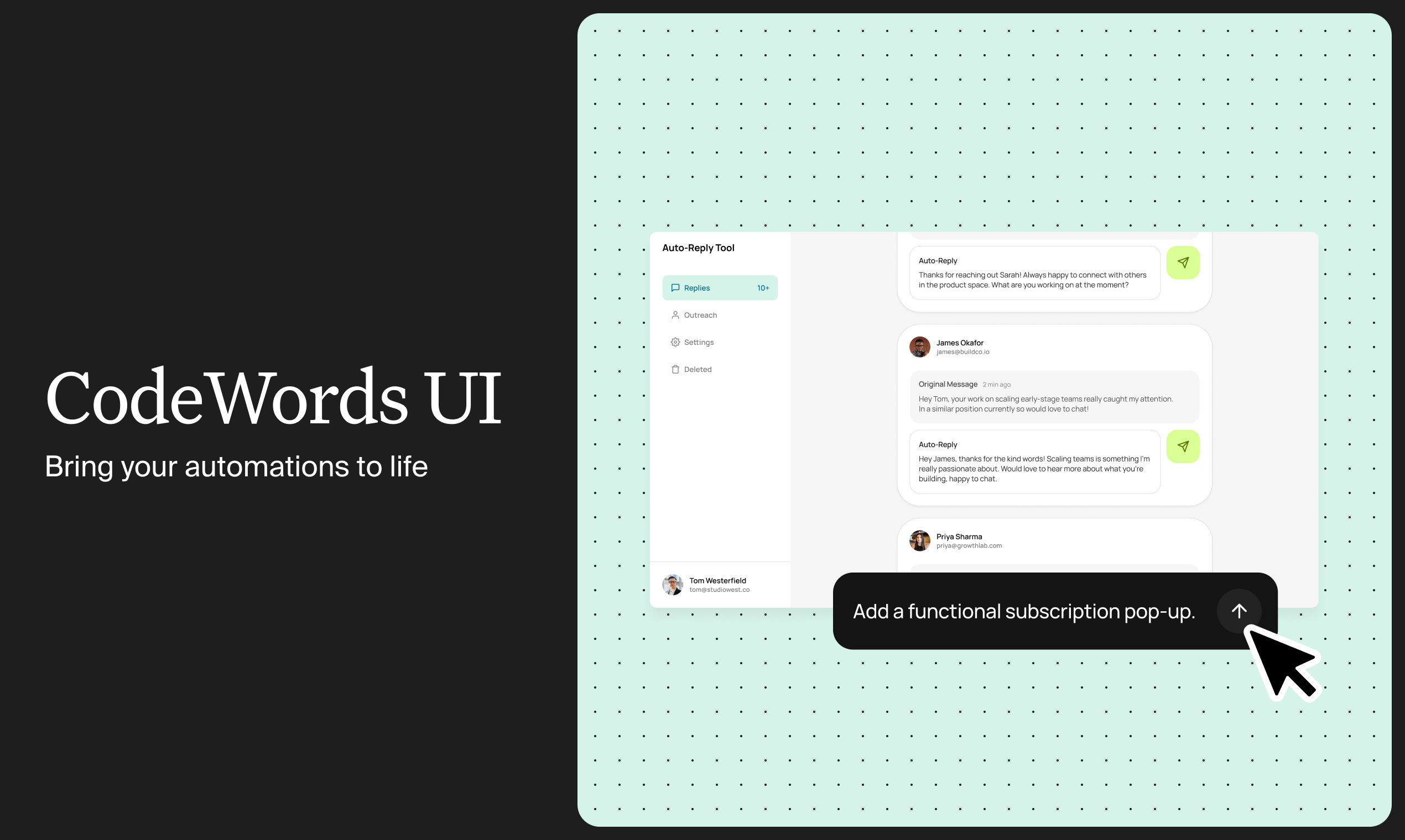 CodeWords UI is available now. Build interactive agents, live dashboards, and visual workflows — all from a single conversation. Turn your automations into full products your clients can see and use.