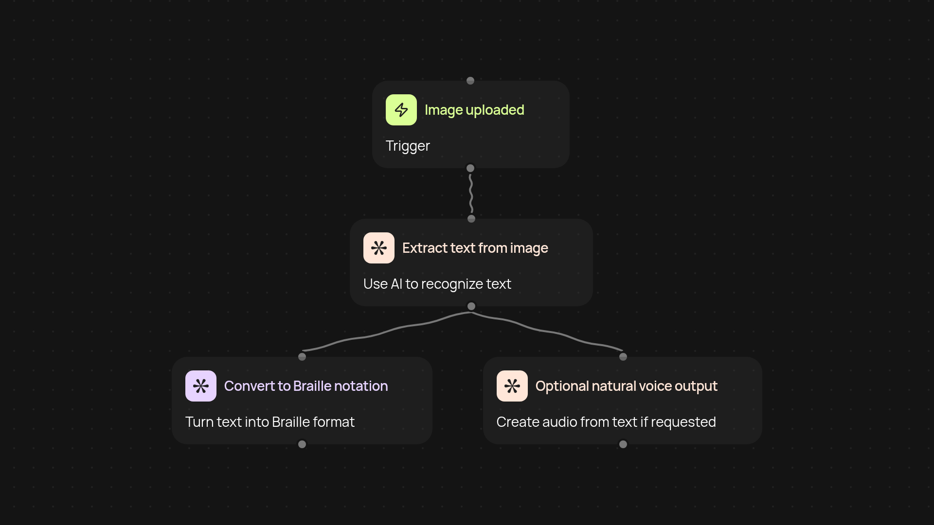 The Accessible Braille Reader gives you a simple way to convert any image containing text into Braille notation — and, if you choose, natural voice audio. Just start the workflow and images are processed in the background, so visually impaired users can access content hands-free. You can instantly receive Braille output or play back an audio version, making printed or digital content much more accessible without any manual effort.