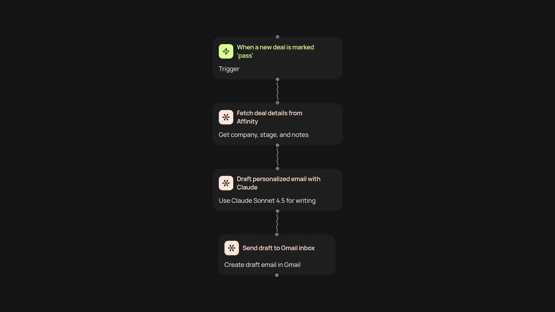 This template fetches key deal details, including company name, deal stage, and any notes you’ve added in Affinity. Claude Sonnet 4.5 uses this context to craft a message that feels hand-written. No more digging around for the right info — you’ll see it flow directly into your draft.