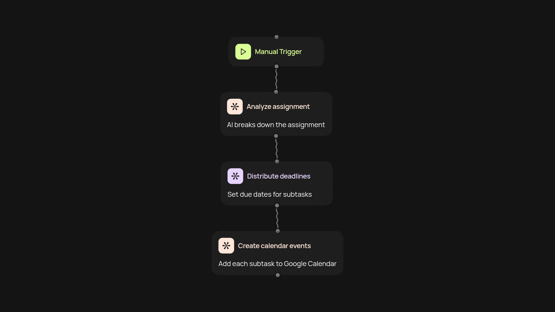All you need is your assignment details and a Google account. Tell CodeWords your deadline, and the automation does the rest: breaks down the tasks, distributes deadlines, and puts them on your calendar. You’ll be ready to tackle any project without lifting a finger.