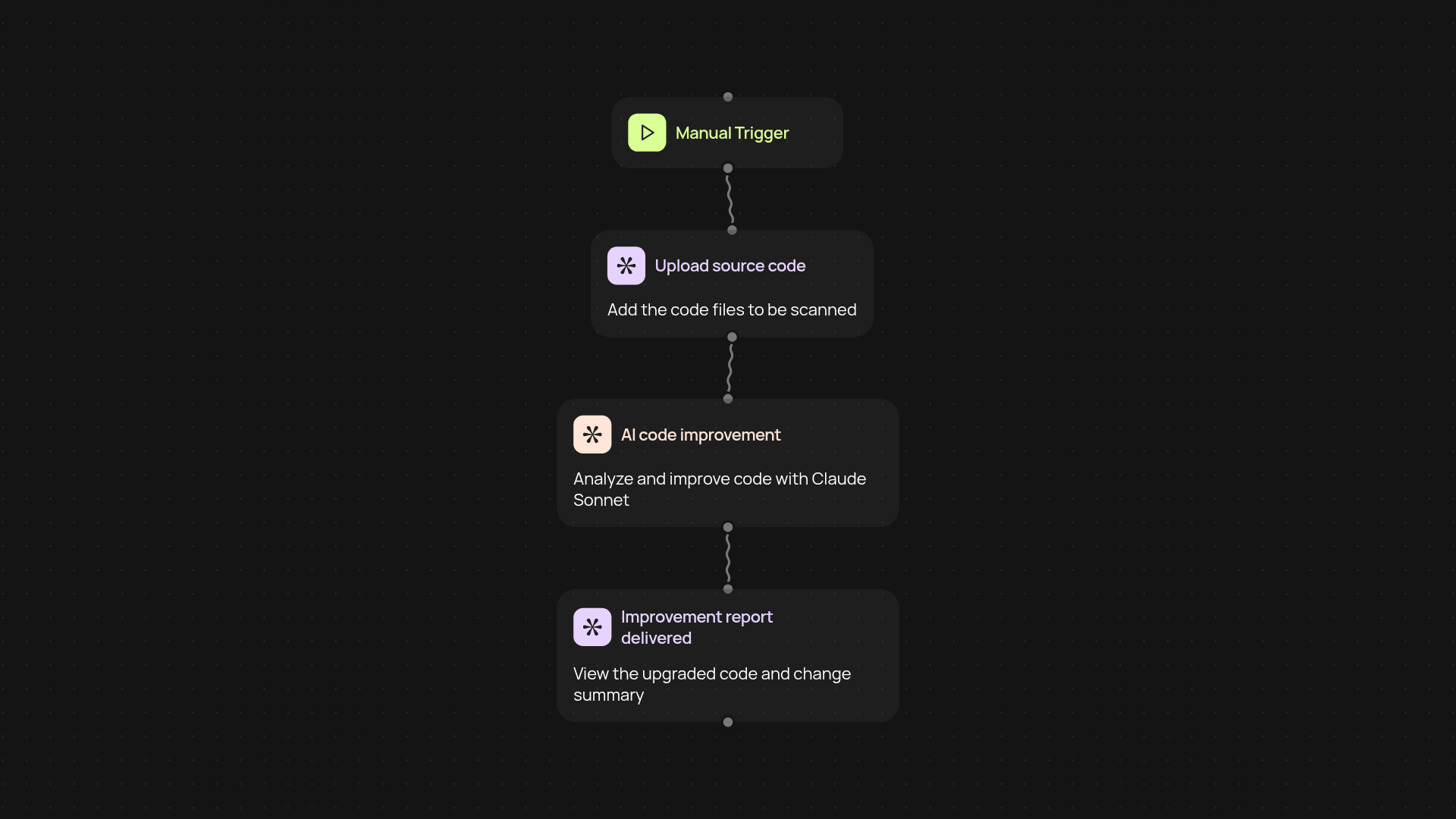 You’ll start by setting a trigger—either run on a schedule or manually. Upload your code files from your source, and set your improvement preferences. That’s it. You’ll receive optimized code and a change breakdown, without any advanced setup needed.