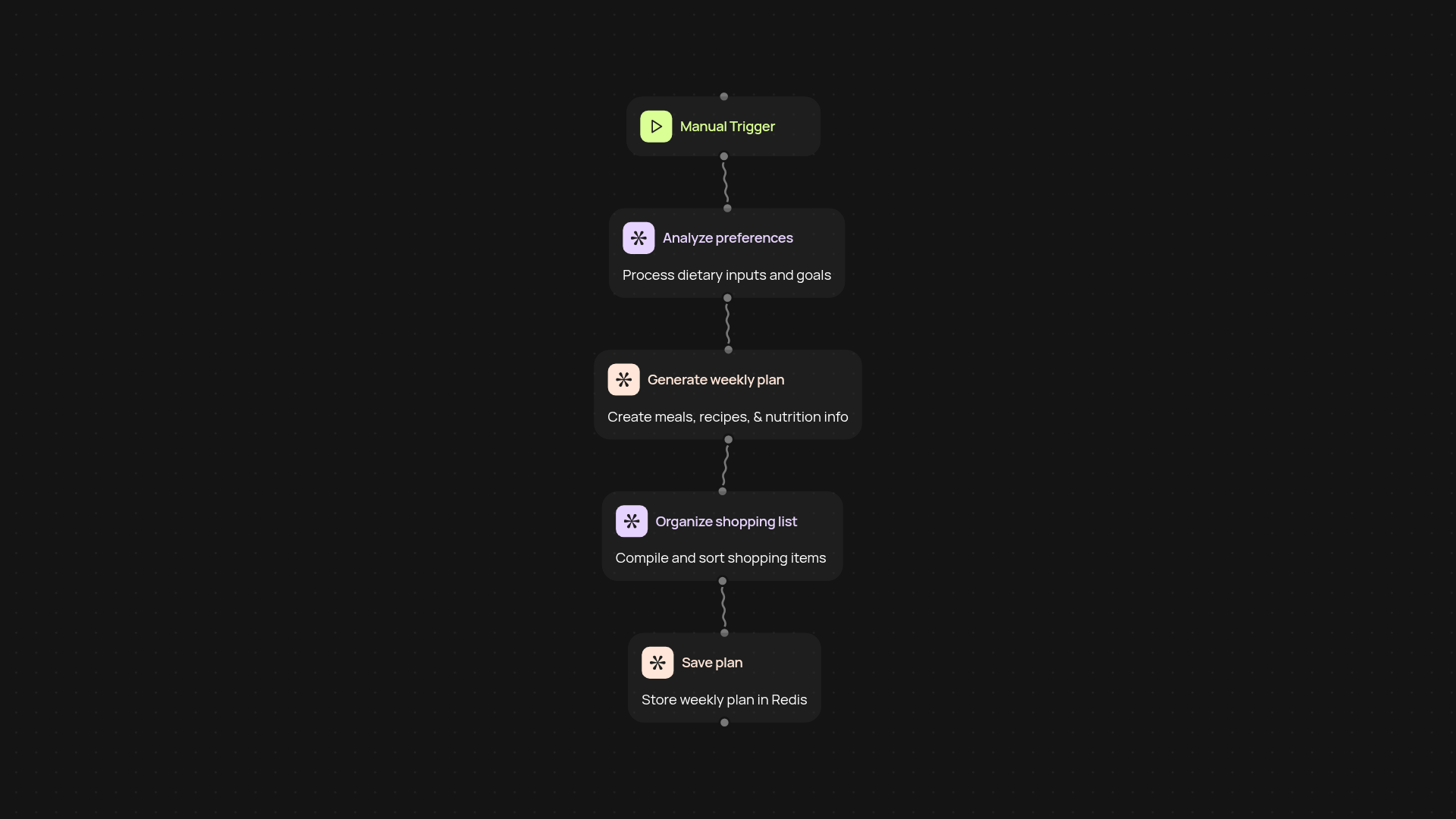 Getting started is simple: trigger the planner, enter your preferences, and let it work. You'll see your plan, recipes, and a categorized shopping list—with no extra tools or downloads. After setup, everything updates from one place. All you need is your meal goals, and you’re ready to go.