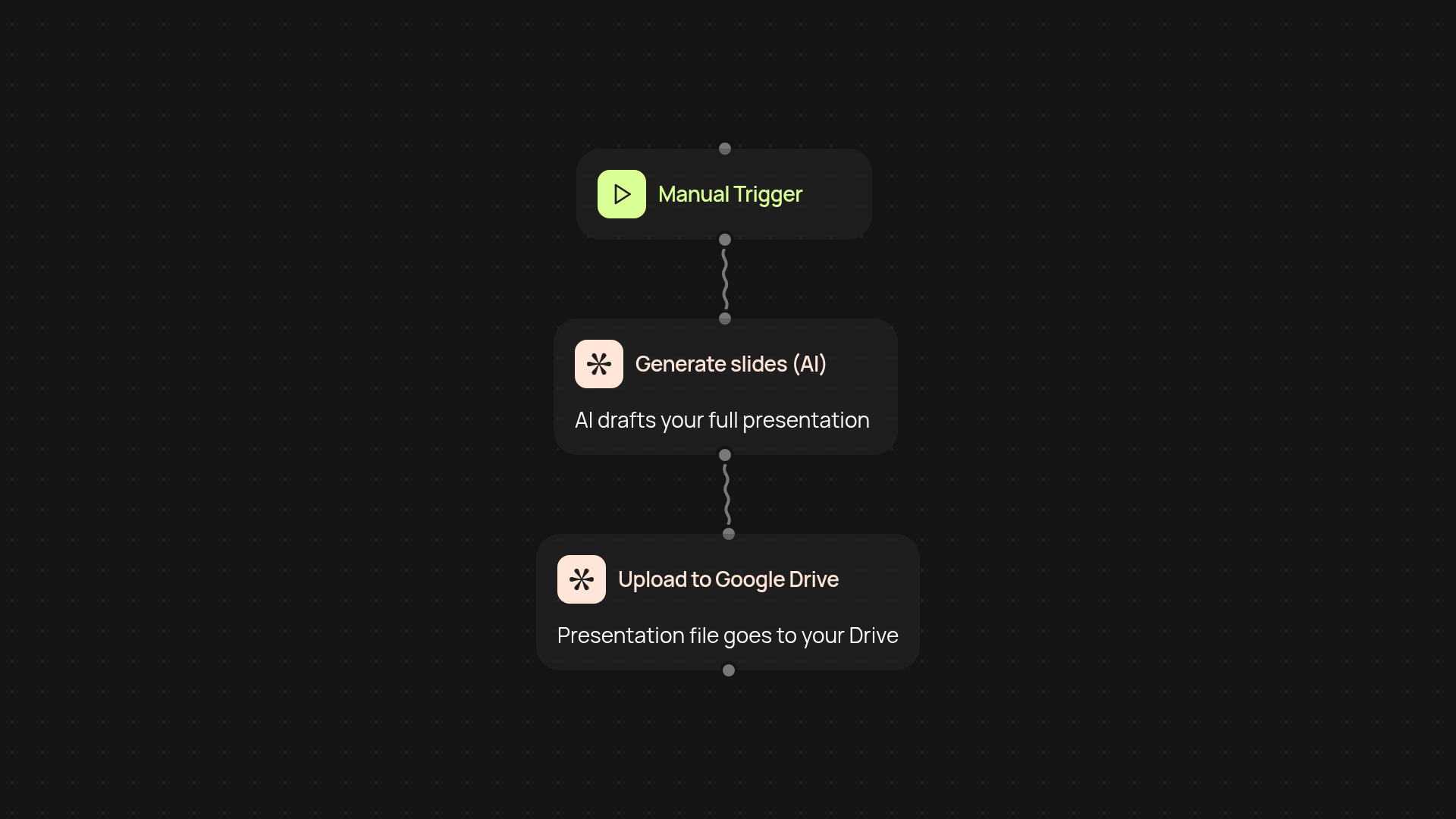 It's simple: just connect your Google Drive account and enter your desired presentation topic when prompted. The process runs in the background and requires zero design skills or software installs to work. You’ll be ready to wow your audience in minutes!