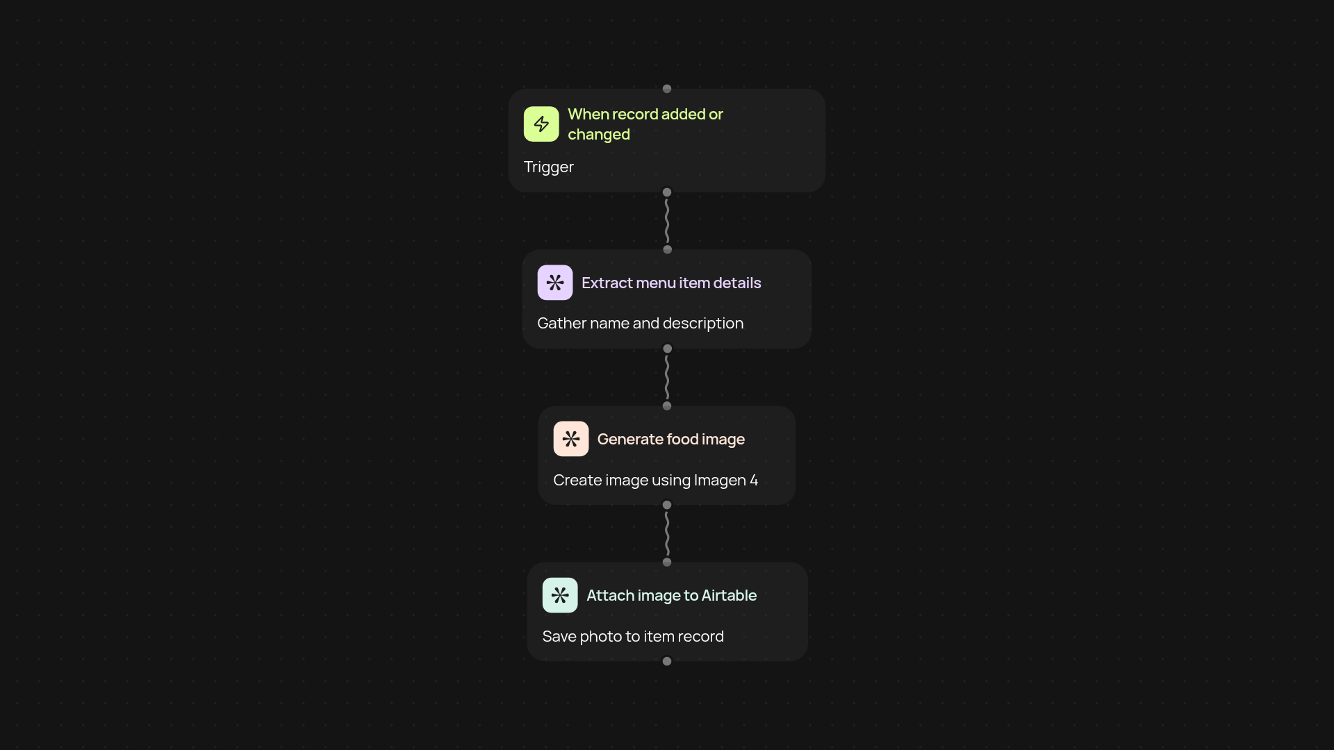 This template lets you transform text menu items in Airtable into stunning, professional food photography in just minutes. Every time you add a new item or update your menu, Imagen 4 creates fresh, high-quality images—no manual design or sourcing required. You keep your menu looking sharp and up to date, with less effort than ever before.
