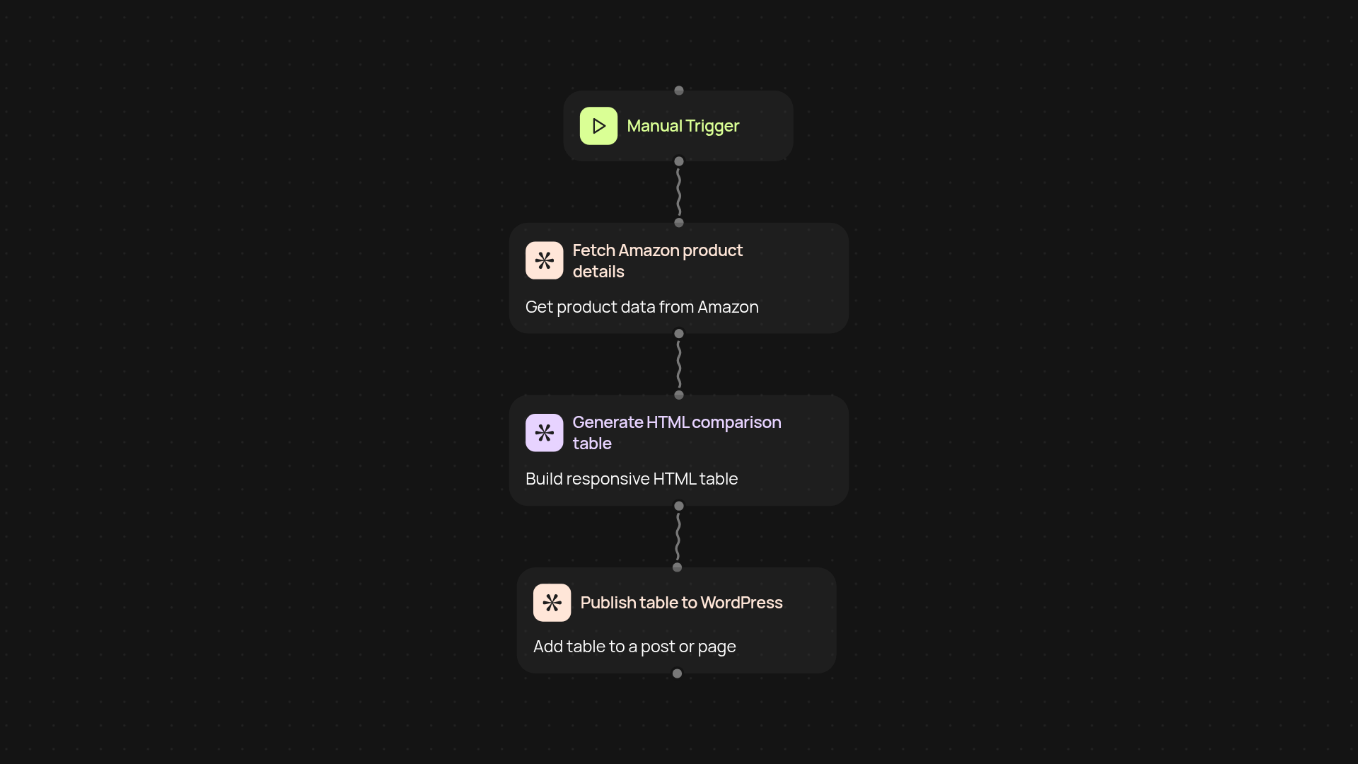 This template takes Amazon product details, builds a comparison table in responsive HTML, and publishes it straight to your chosen WordPress site. No need to copy-paste product info or wrestle with formatting — just set your criteria and let the workflow do the rest. You get professional-looking tables in minutes, ready for your affiliate blog or review site.