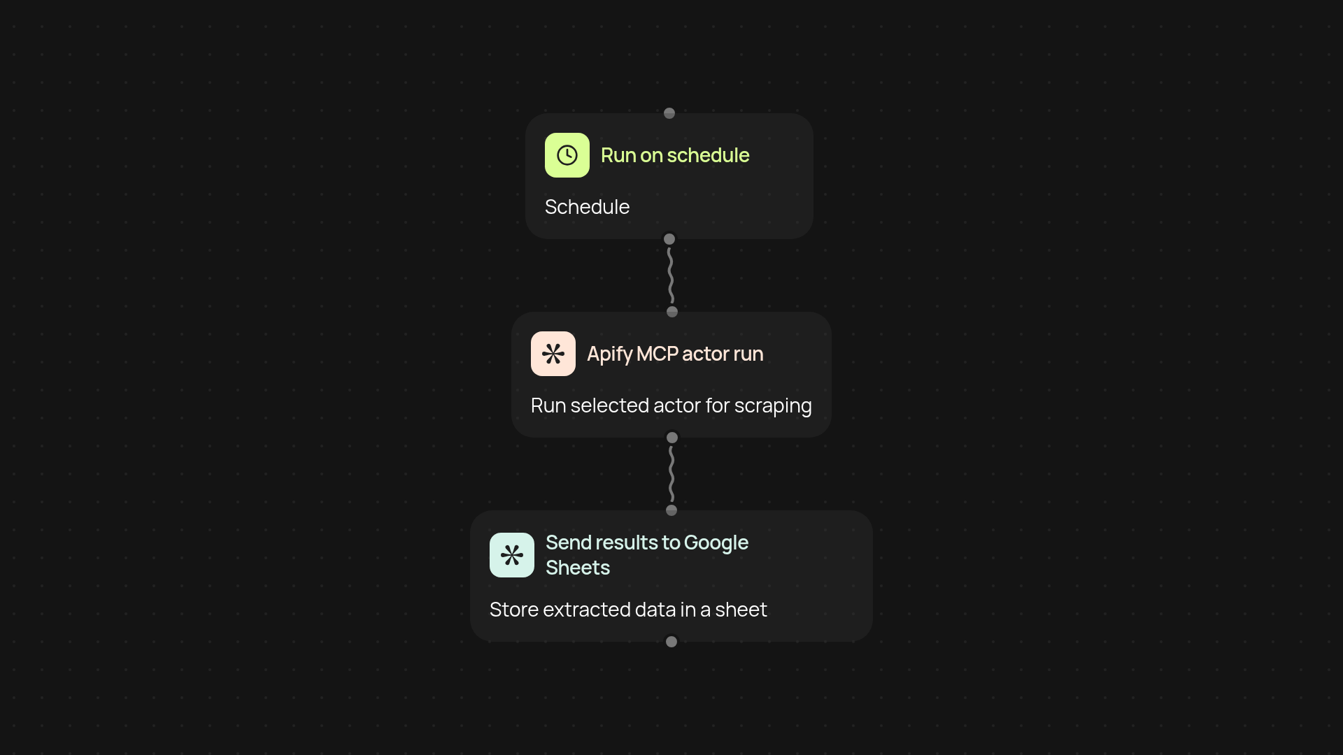 Just connect your Apify MCP account and choose an actor from the library. Select a trigger that makes sense – schedule it, or run it with a click. Add any integrations where you want the results delivered. That’s it—no technical expertise required. Start building your automated data flows in minutes, and watch the manual work disappear.