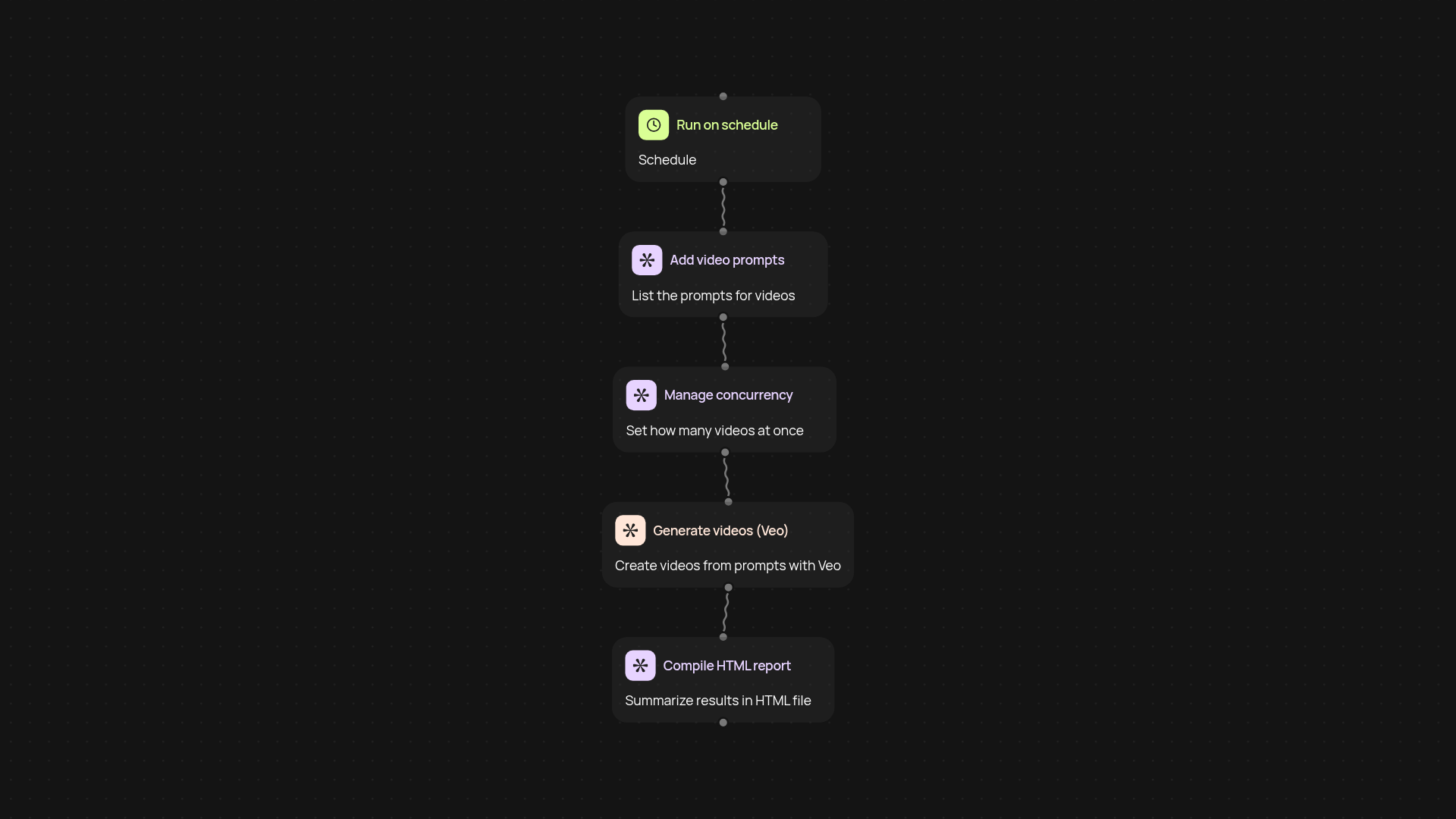 All you need is your list of prompts and a Google Veo account. Set up your workflow by choosing your batch size and any concurrency controls you want. Then trigger the automation and relax while CodeWords takes care of everything in the background — from handling prompts to compiling your final report.