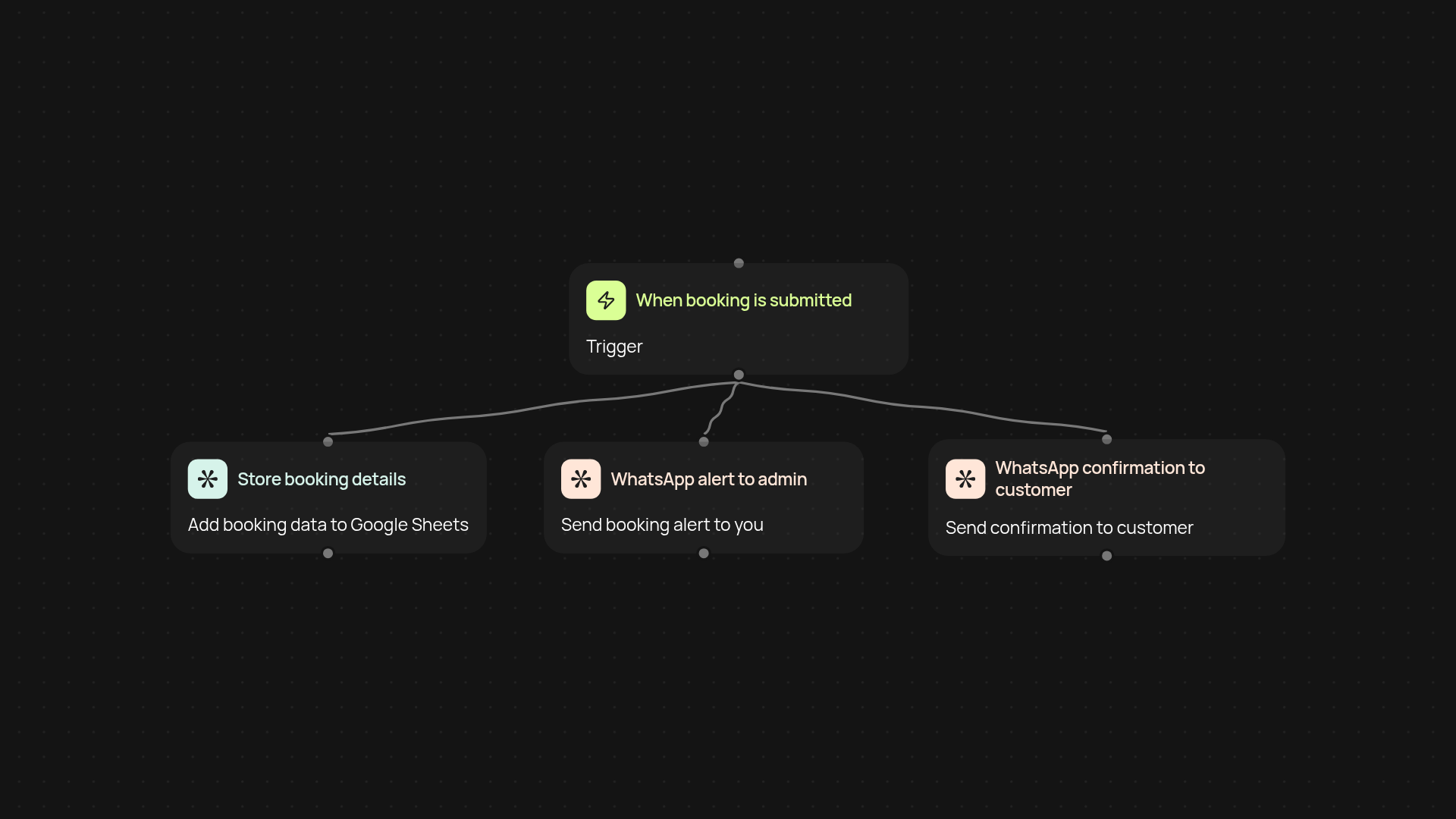 This template catches new booking submissions, organizes the data in Google Sheets, and sends immediate WhatsApp confirmations — all without manual work. As soon as a booking is received, your sheet updates on autopilot and WhatsApp messages go out to both you and your customer. Never miss a booking again.