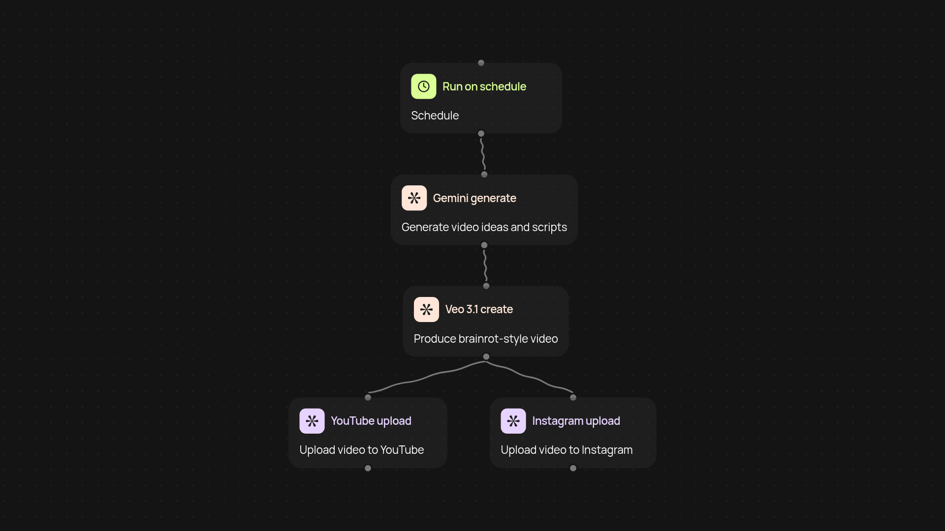 Forget about spending hours generating content — this template handles every step for you. It uses Gemini to brainstorm engaging, brainrot-style video concepts, then relies on Veo 3.1 to produce eye-catching clips that fit viral trends. Once your video is ready, CodeWords uploads it directly to your YouTube and Instagram accounts in the background. No manual editing, rendering, or posting headaches — you simply set the process up and let it run.