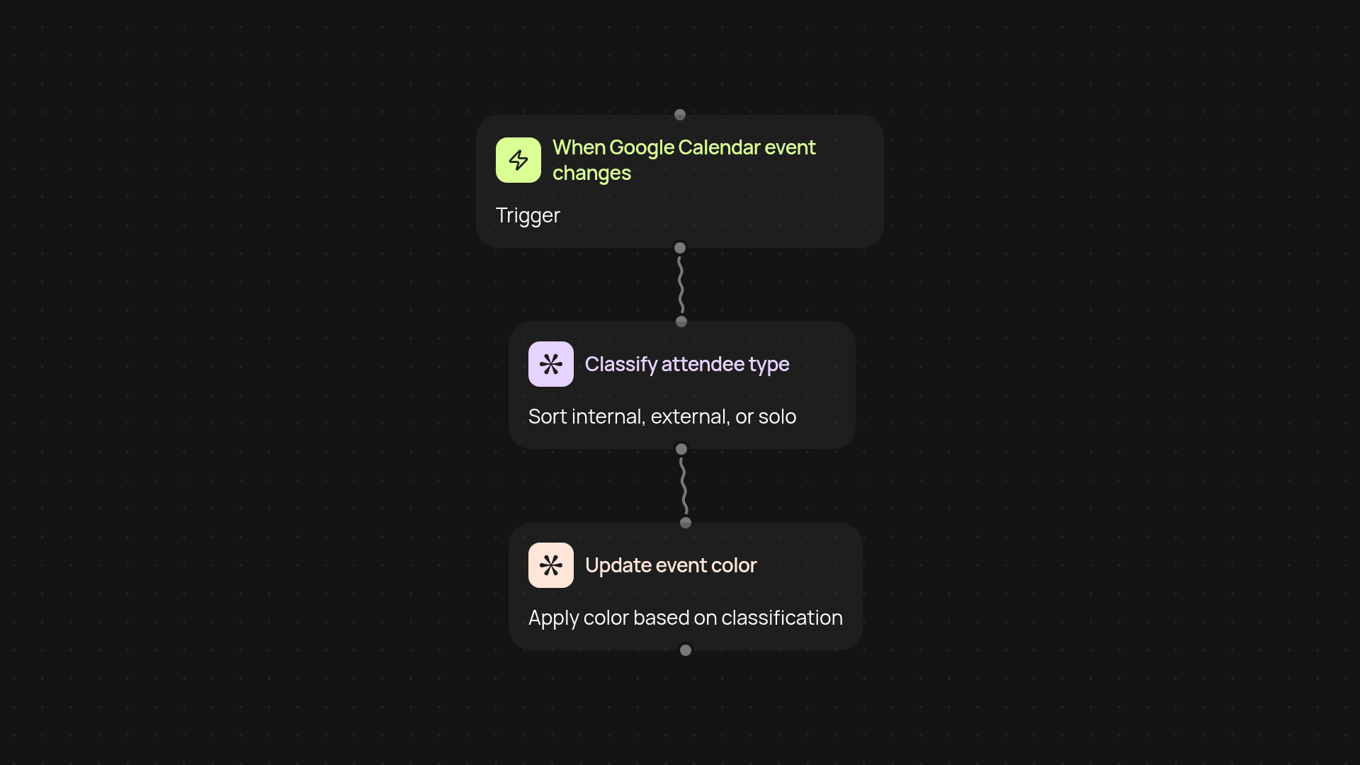 Events are classified by attendee email addresses, so internal meetings (with colleagues) get one color, external meetings (with people outside your company) get another, and solo blocks stand out with their own shade. You don’t need to set up complicated rules—everything runs without manual work, using what’s already on your event.