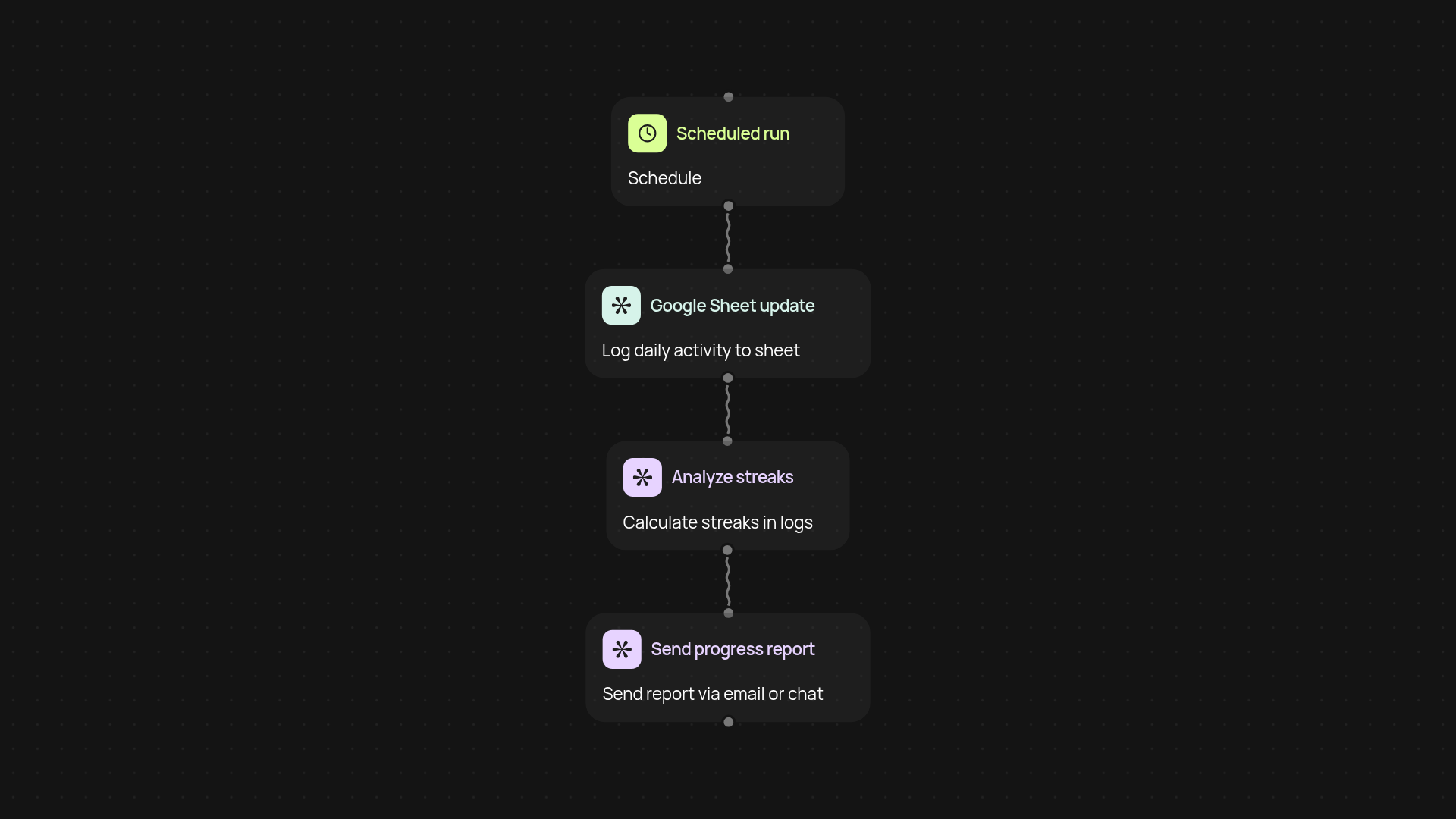 The system summarizes your activity and highlights trends in your custom Google Sheet. You’ll receive regular summaries of how well you’re sticking to your routines, as well as simple analytics to spot patterns and keep your streaks alive. Everything is tracked in one central place you already know how to use.