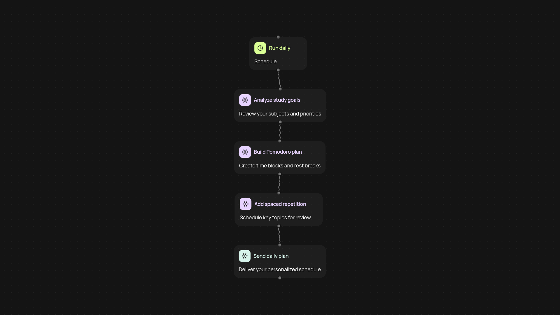 The daily study planner creates a personalized schedule for you, blending the Pomodoro technique with spaced repetition so you cover every subject efficiently. Instead of juggling conflicting priorities or wondering what to study next, you get a step-by-step plan that keeps you focused, boosts retention, and makes every session count. All you need to do is follow the clear, actionable guide prepared for your day.