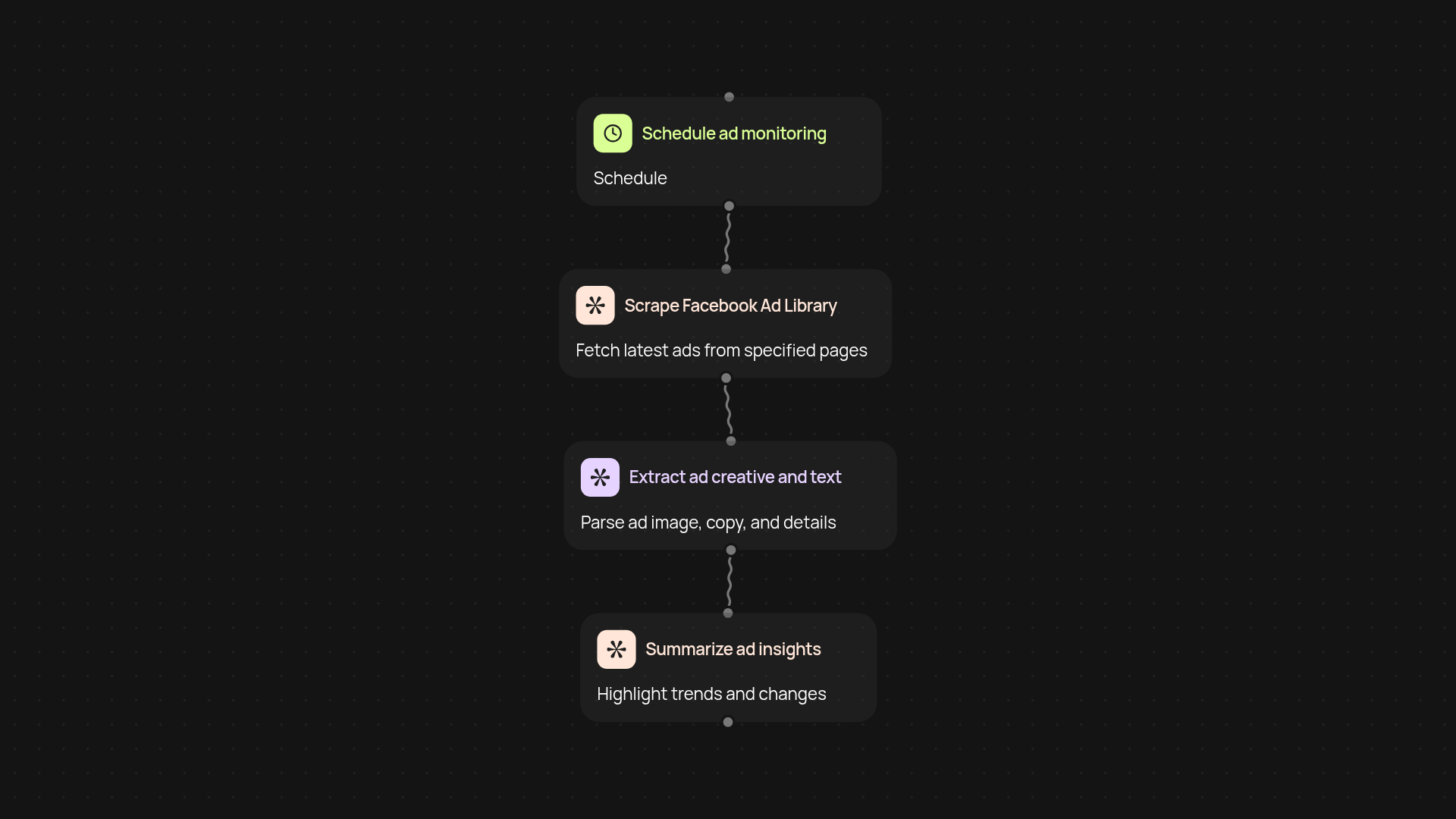 Getting started is simple — just input the Facebook pages or advertiser URLs you want tracked and set your update schedule. The tool runs in the background, fetching updates as often as you’d like. All you need is a list of competitors and a CodeWords account. No technical steps required and setup takes just a few minutes.