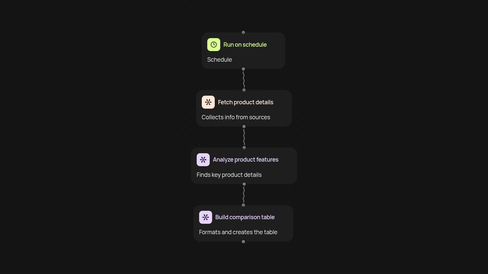 With the feature comparison table generator, you can build clear, detailed product comparison tables hands-free. Start by triggering the workflow — on a schedule or whenever you need to compare a set of products. The tool collects product details, analyzes each one, and then creates a structured, easy-to-read table that highlights key differences and similarities. This all happens in the background, so you get a polished table ready to share without lifting a finger.