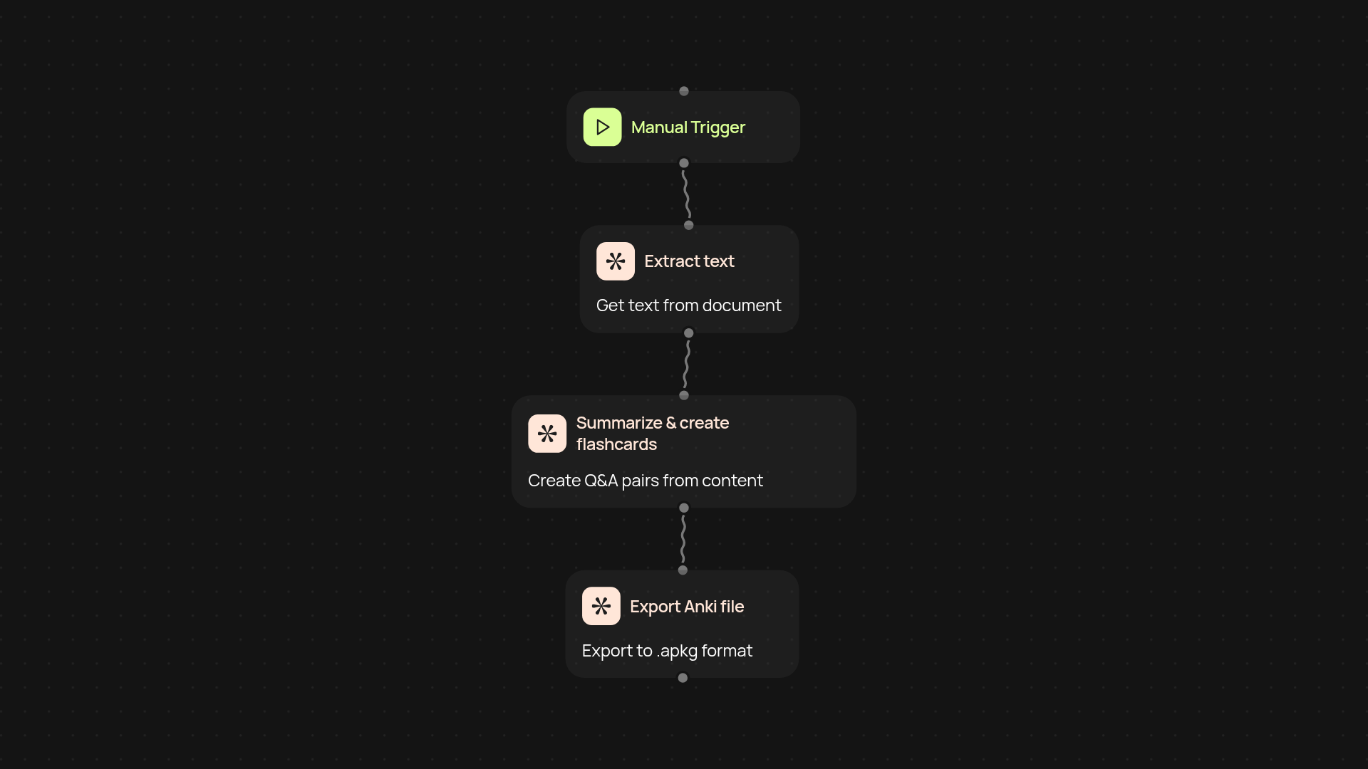 The Flashcard Generator instantly converts any document—be it a textbook, slide deck, or research article—into ready-to-use Anki-compatible flashcards. Whether you're prepping for exams, making study aids for your class, or quickly distilling key points from a meeting note, the process happens automatically. Upload a file, and within moments, you’ll have a complete set of study cards that cover the essential concepts, facts, and ideas from your material.