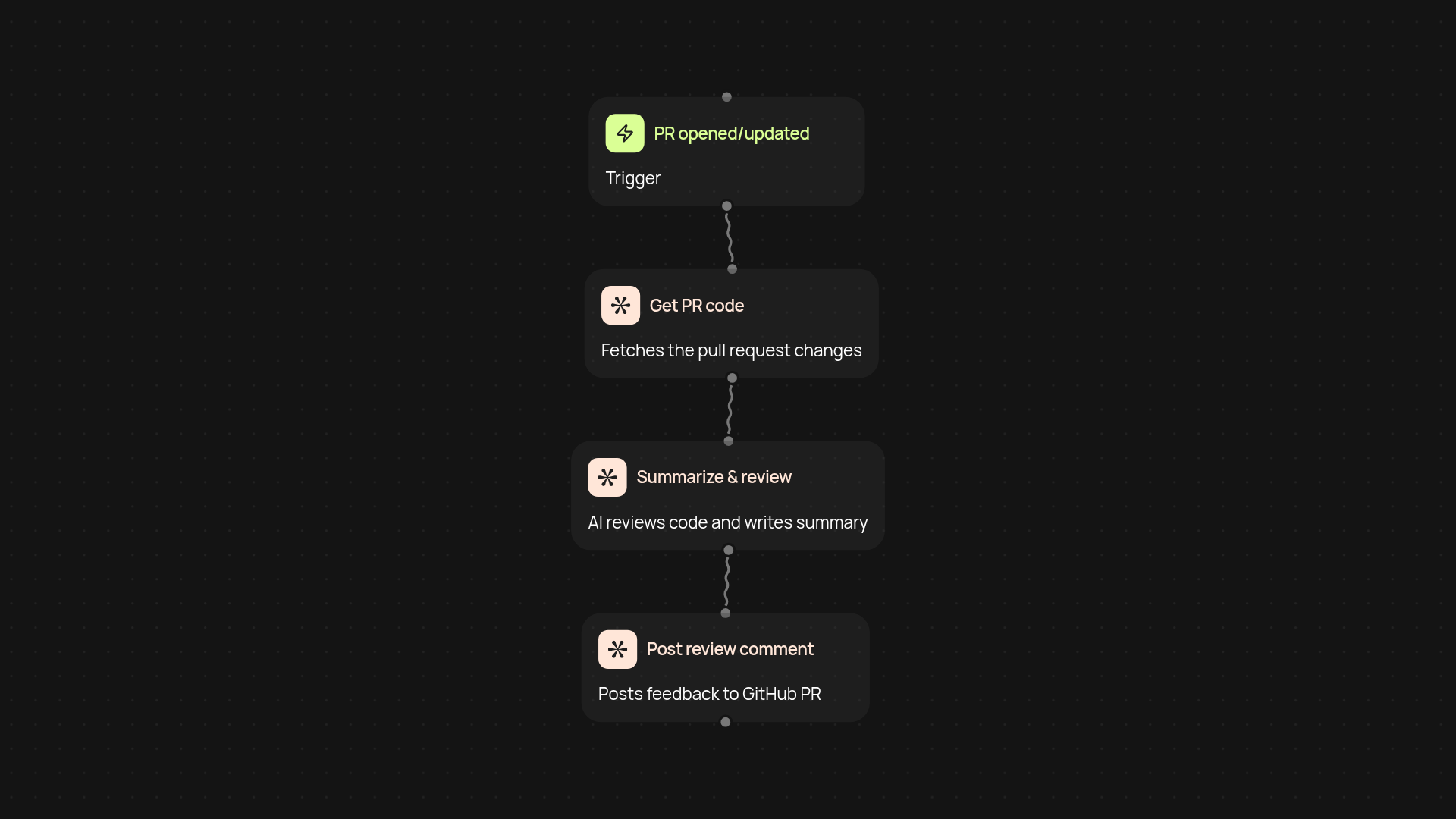 This template connects your GitHub repository with advanced AI for hands-free pull request reviews. Every time a pull request is opened or updated, the process kicks in right away — drafting high-quality review comments without you having to lift a finger. It reads code changes, summarizes what's important, and highlights improvements so you can deliver better reviews in less time.