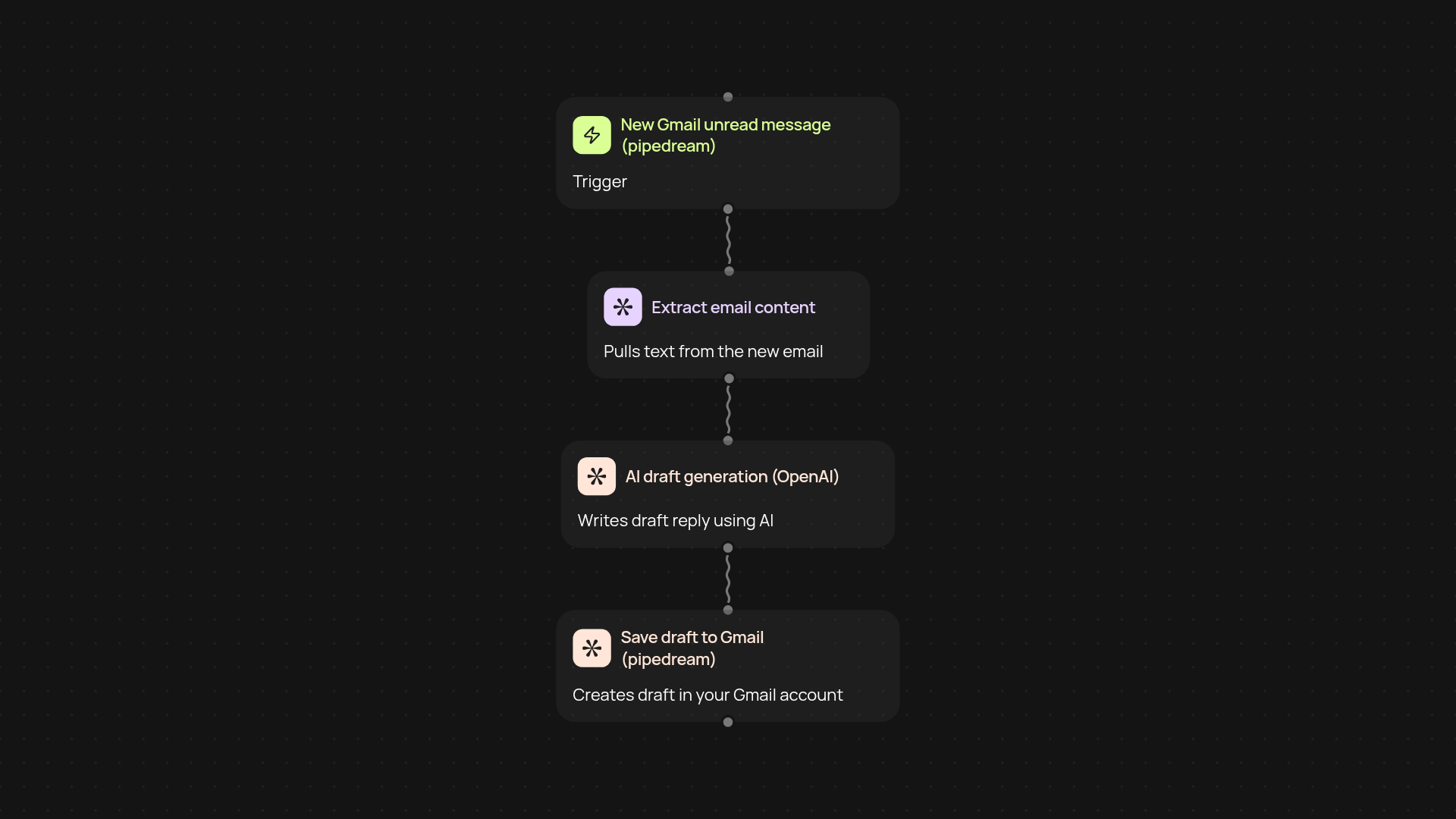 With Gmail Draft Auto Responder, you never have to start email replies from scratch again. This template monitors your Gmail inbox for new, unread messages. When a new email arrives, it uses the latest AI technology to instantly create a draft response—ready for you to tweak and send. No more staring at a blank email or spending your day buried under message replies. Your inbox basically works for you, letting you respond faster and more thoughtfully, without lifting a finger.