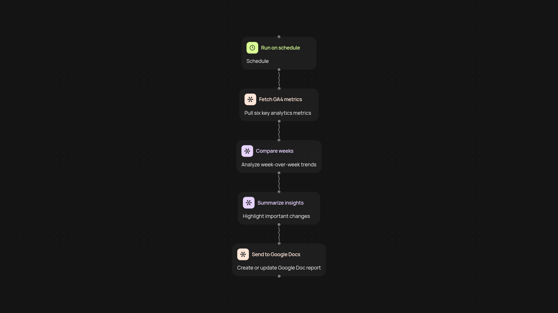 You get a fully formatted weekly GA4 report, ready for execs — no spreadsheets or screenshots required. CodeWords connects to Google Analytics, collects key data from six metrics at once, compares this week's results to last week's, summarizes highlights, and can send or store everything in Google Docs. Skip the tedious work and focus on what matters: the insights.