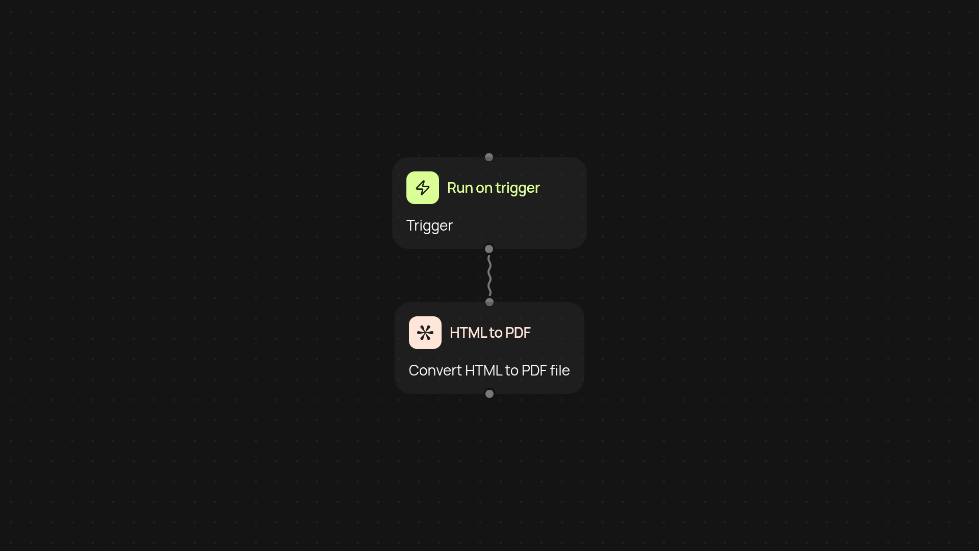 You can create professional PDF documents from any HTML content — without lifting a finger. CodeWords automatically renders your formatted HTML as a ready-to-share PDF using Playwright, so your team never has to worry about manual exporting or inconsistent results. Use it for invoices, reports, marketing collateral or website snapshots. Everything looks exactly as you intended, every time.
