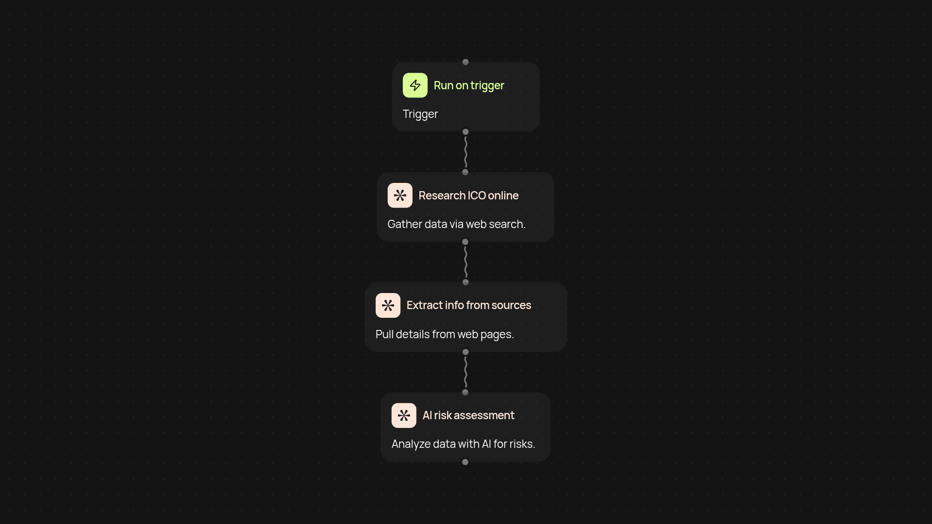 First, the template tracks down recent news, official documents, and expert opinions about the target ICO. Next, it combines these sources and uses AI to pinpoint red flags, credibility signals, and broader market sentiment. The result? A trustworthy summary of essential ICO facts plus a risk rating, so you're well equipped to act—or hold back—without lifting a finger.