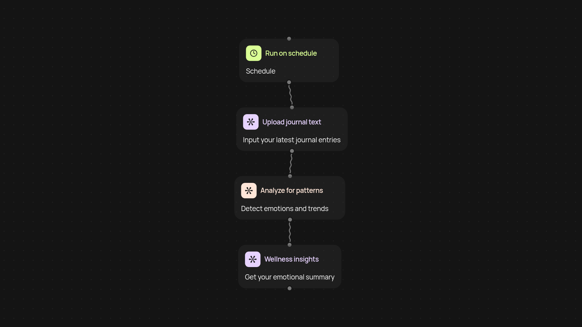 You’ll only need your journal entries in a text format. Start the process when you like, or set it to analyze on a schedule. CodeWords takes care of everything else and delivers results instantly. No technical background needed. Just upload, run, and review your personalized wellness snapshot at any time.