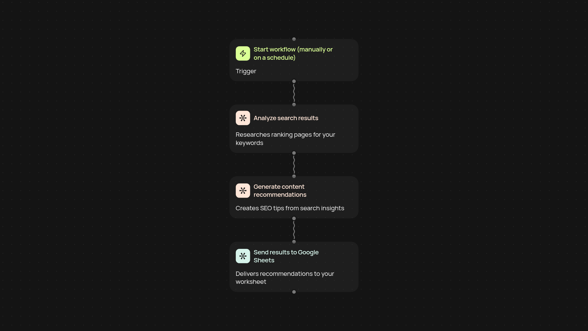 Getting started is simple. Just connect your Google Sheet, select your target keywords, and let the template get to work. You don’t need any technical background — everything happens in the background, and your recommendations are delivered automatically. Save time every week and optimize your website more effectively, right from day one.