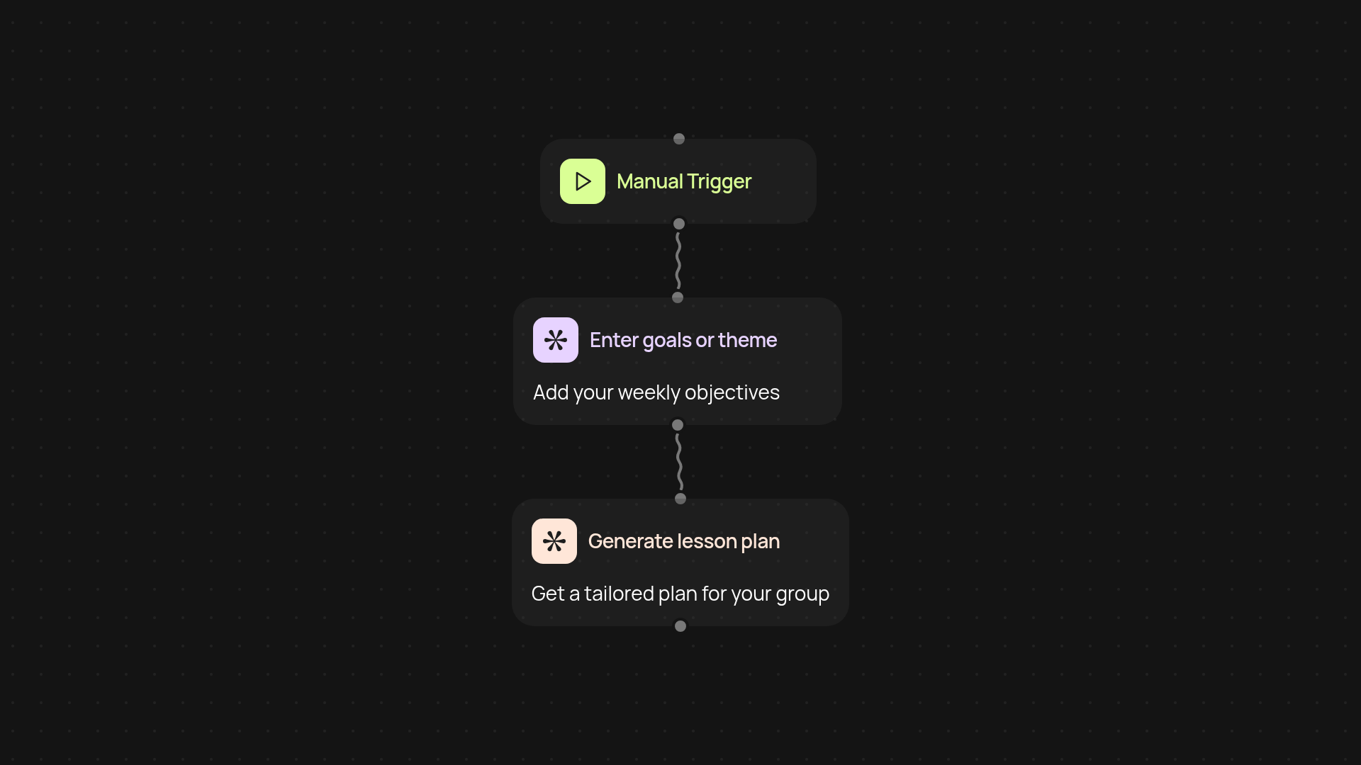 Getting up and running is simple. Start by triggering the planner, add your desired learning goals or focus topics, and review your generated lesson plan. All you need is a web browser and your class objectives — the rest is handled automatically. In just a few clicks, you’ll have a full week’s plan ready to print or share.