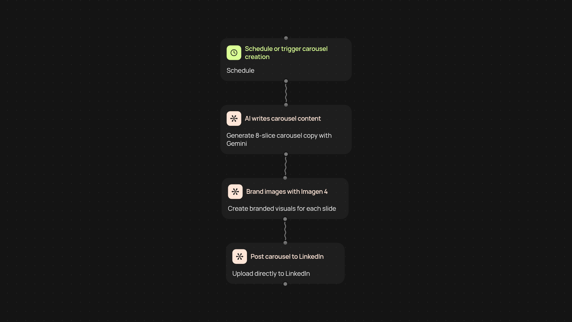 You simply provide a topic or idea—CodeWords instantly handles the rest. Our AI writes 8-slide LinkedIn carousel copy, creates branded visuals with Imagen 4, and posts the carousel to your LinkedIn account without manual work. You get polished, professional carousels delivered to your audience on schedule. No need for design chops or constant content brainstorming—just fresh, engaging posts that keep you visible and top-of-mind.