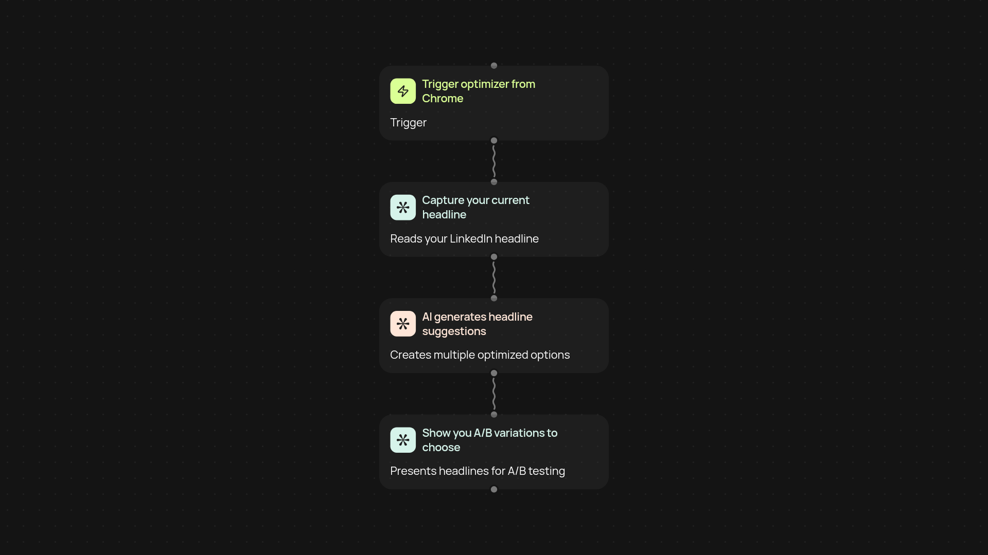 First, you trigger the workflow from your Chrome browser while on LinkedIn. The tool captures your current headline, then uses AI to suggest several optimized options tailored to your role and goals. You receive easy-to-compare choices, making it simple to see which headline style resonates best. Results appear instantly, so you don’t have to copy and paste or brainstorm new ideas yourself.
