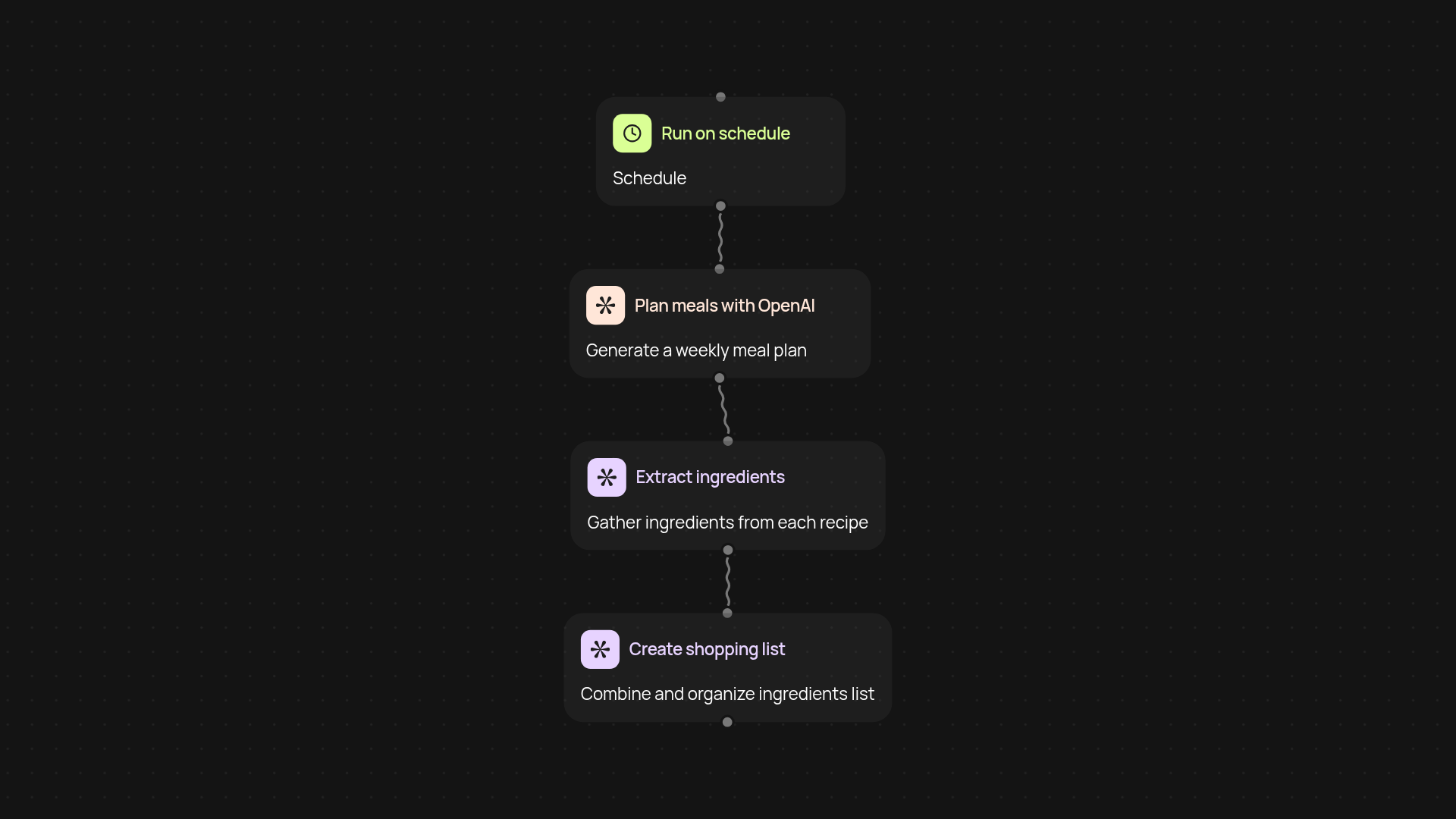 You just need your meal preferences, any dietary restrictions, and a minute to start the workflow. Set your routine to run on your schedule — and you’re ready to enjoy a week of organized, stress-free meals.