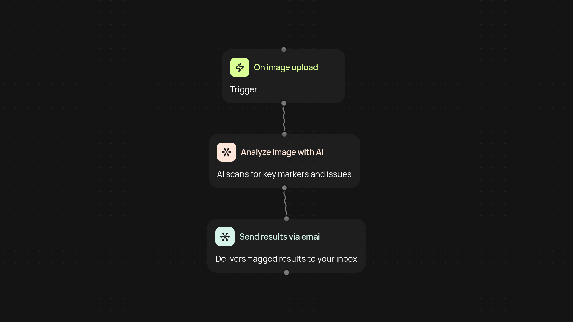 This template reviews medical images using AI, flagging potential concerns before you even open the file. As soon as new images are uploaded, they’re analyzed in the background — so you get a first-pass report without lifting a finger. Detect problems early, prioritize cases, and make every scan count.