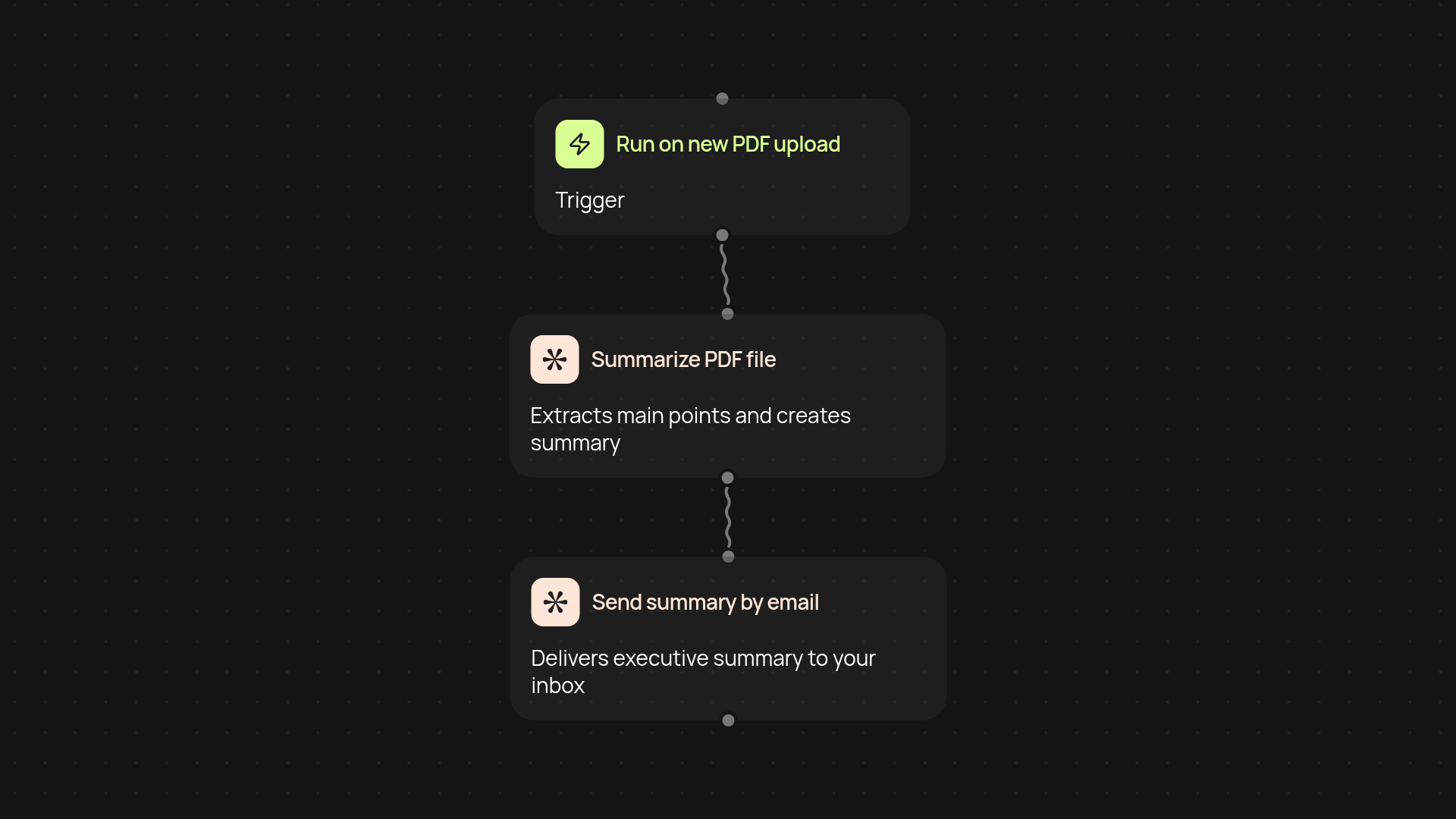 Getting started is simple. Just choose how you'd like to trigger the summary—upload a document, tie it to an email inbox, or set up automatic runs. All you need is your PDF file, and the system does the rest in the background. No technical skills are required, so you can be up and running in minutes.