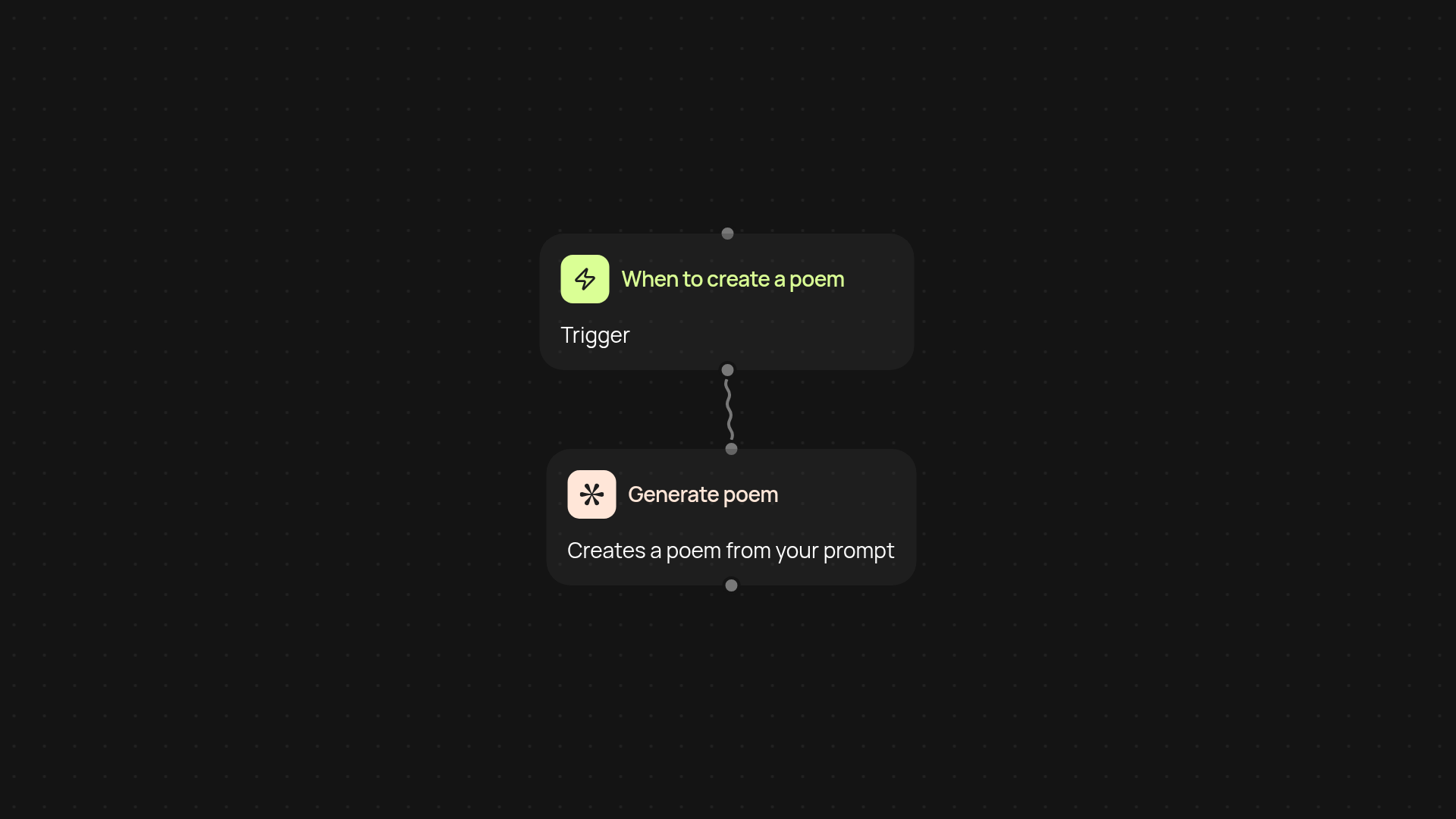 Get poetry created on autopilot when you need it. Set the trigger that works for you — create new poems on a schedule, after an event, or whenever you need new content. The generator delivers your results instantly, helping you keep your content fresh and creative, without repetitive writing tasks.