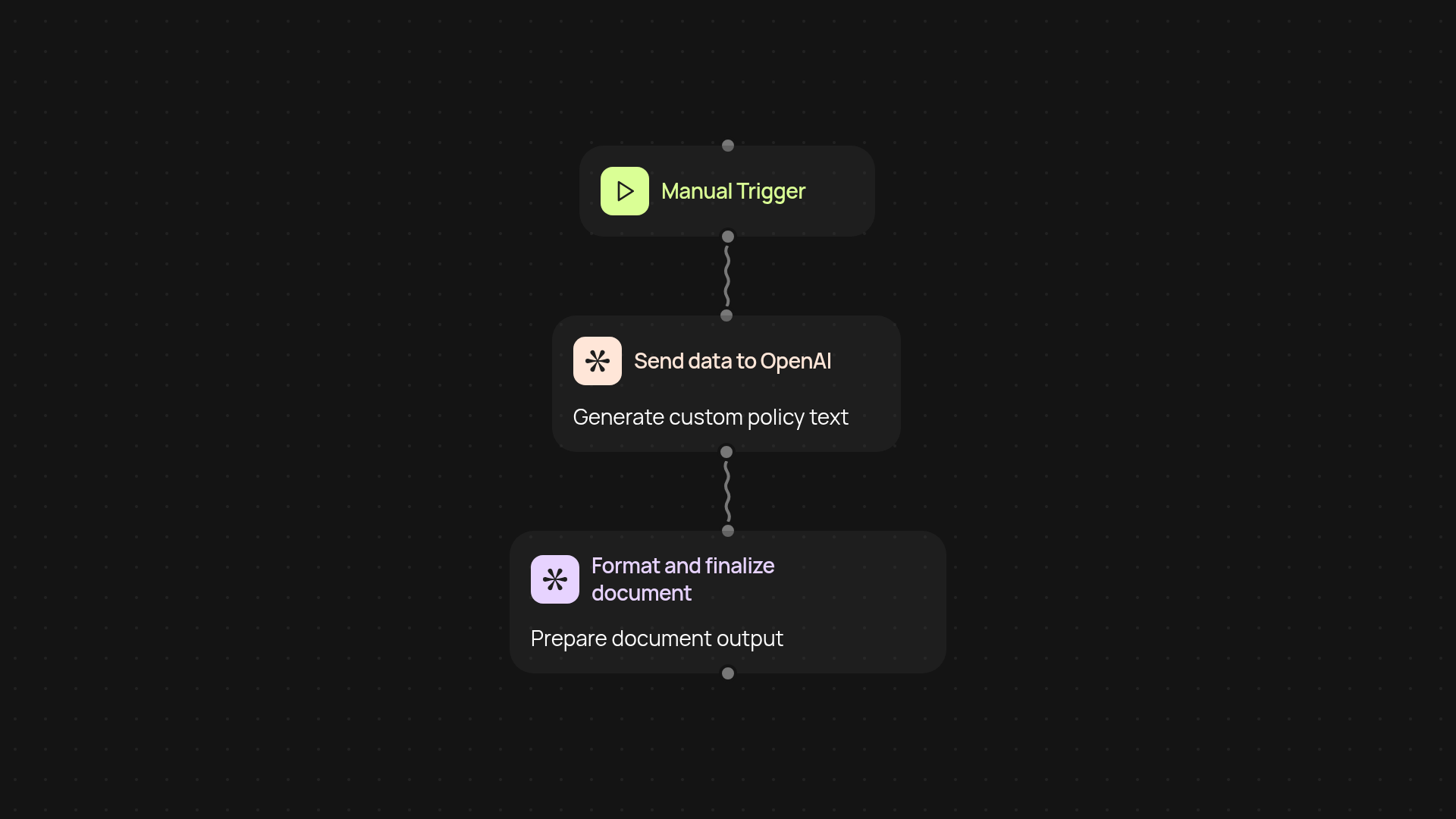 Getting started is simple. Run the template manually or schedule it to generate documents on a regular basis. You only need your company name and the type of policy needed. No technical setup — just fill in your details, review the output, and share or store your policy document wherever you need.