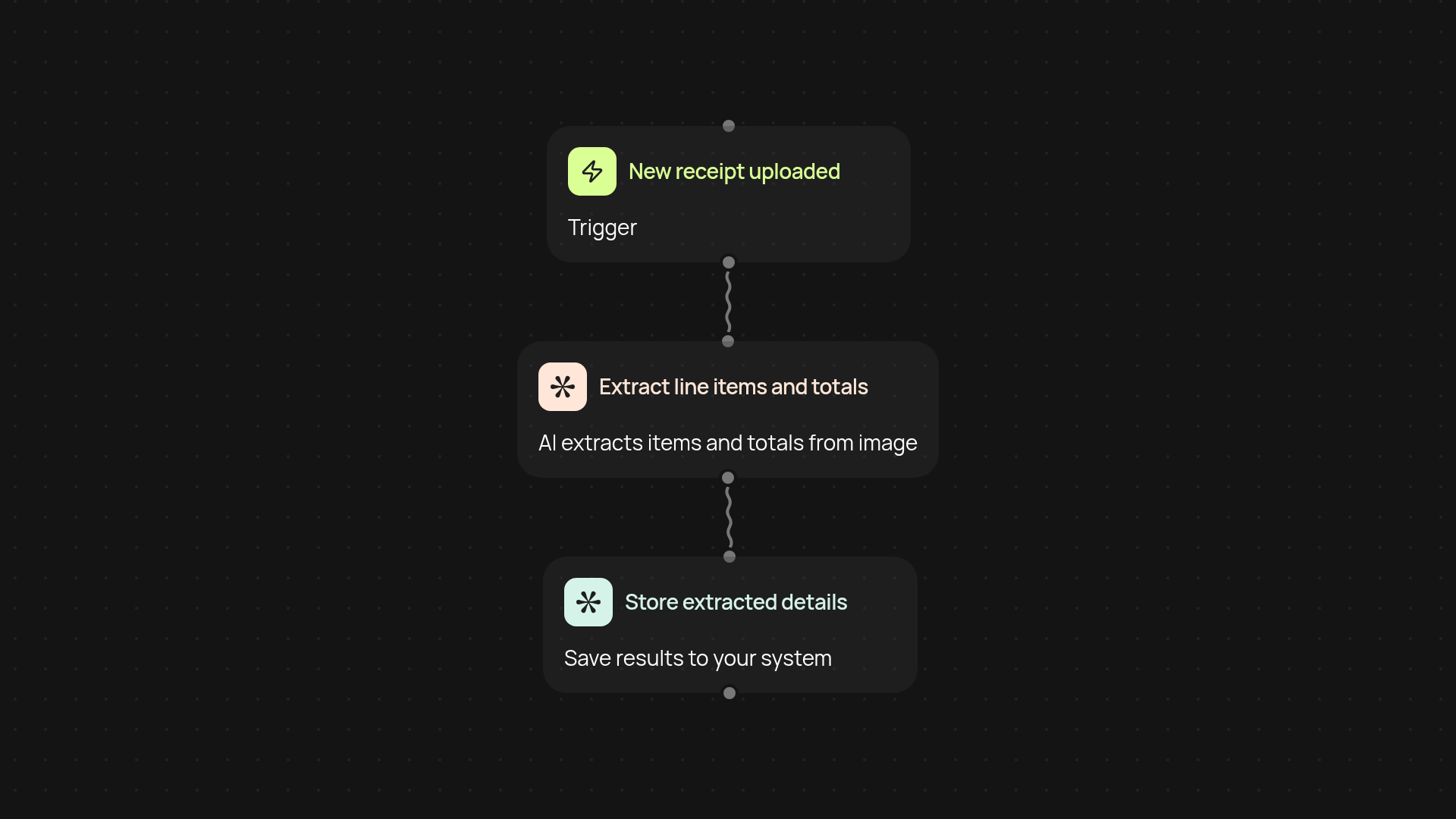 You'll just need a CodeWords account and the receipt images you wish to scan. Upload receipts manually, or set up a trigger to scan new receipts automatically in the background. In minutes, your expense data will be organized and ready to use — no setup headaches required.