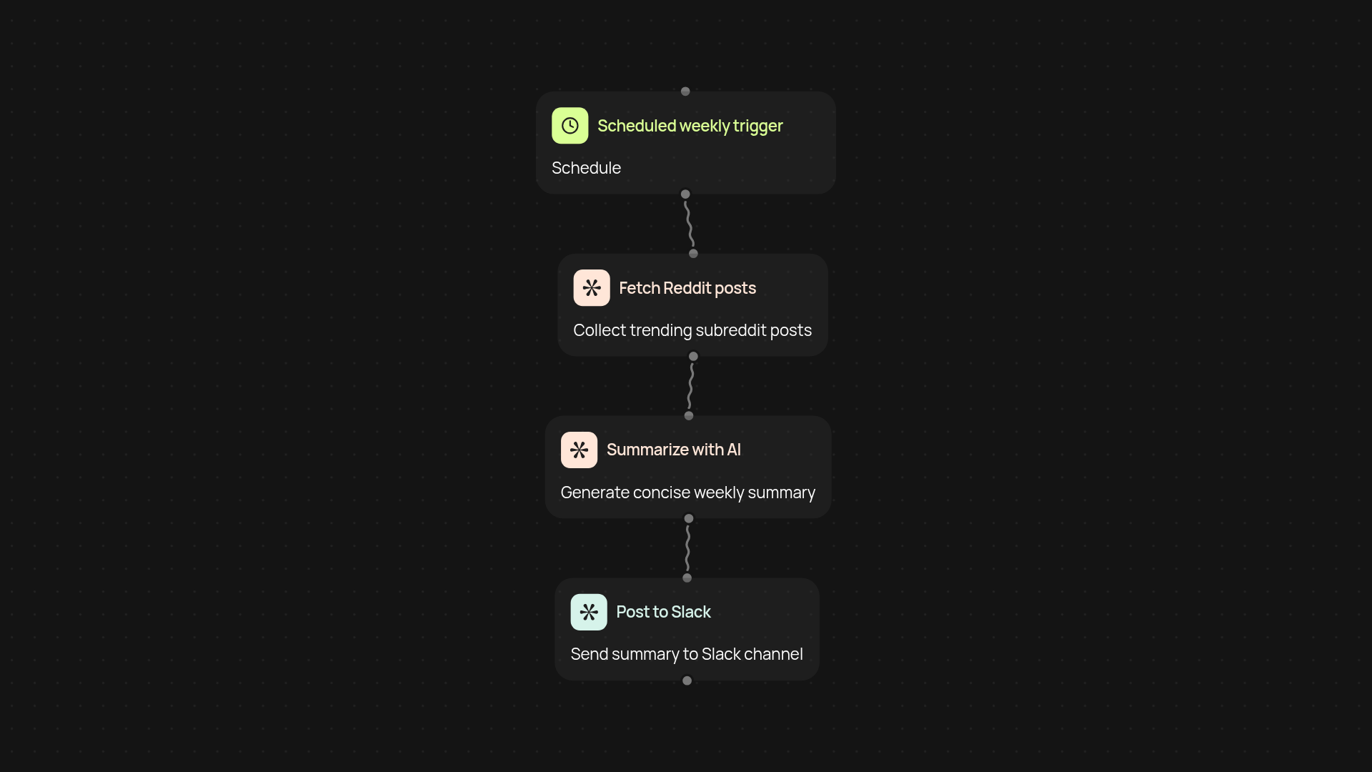 Each week, this template tracks your selected Reddit communities. It finds what's trending, builds a summary using AI, and posts it right to your Slack channel. Your team gets the important highlights — no more spending hours on Reddit or missing out on industry threads.