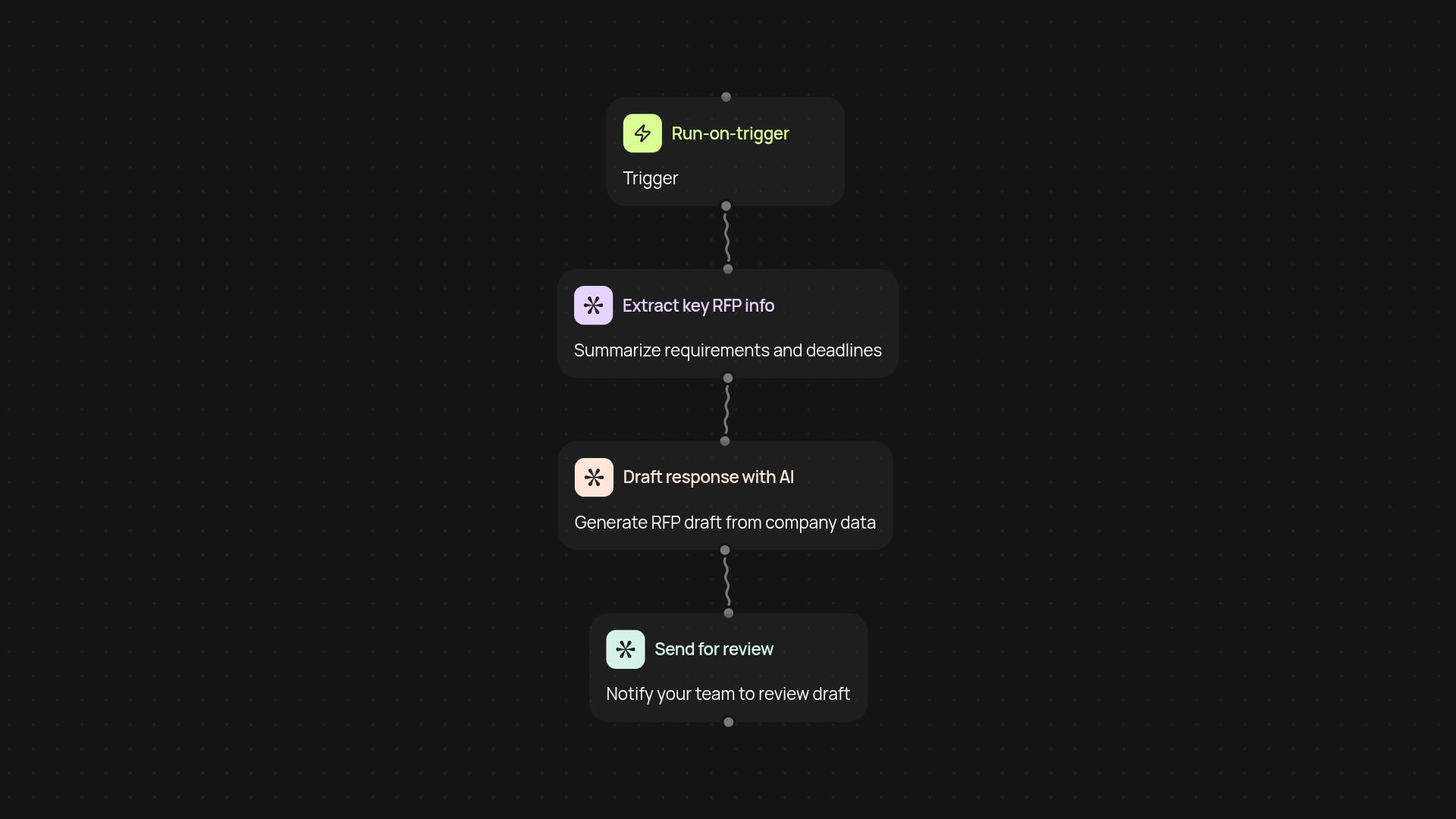 This workflow takes the hassle out of responding to RFPs. It starts by receiving RFP details—whether submitted manually or through your CRM—and instantly crafts a tailored, insightful response draft you can review. Your team can quickly polish and submit, cutting days off your proposal process.