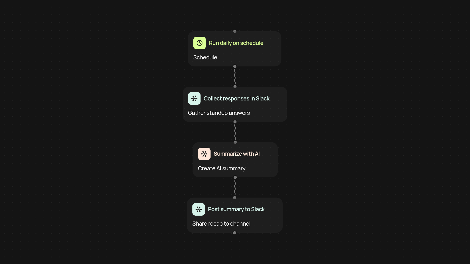 Get your daily team standups gathered and summarized in Slack—without chasing anyone for updates. This template collects individual responses from your team, organizes answers, and uses AI to generate a clear, concise summary. Everyone stays in sync and you free up hours every week.