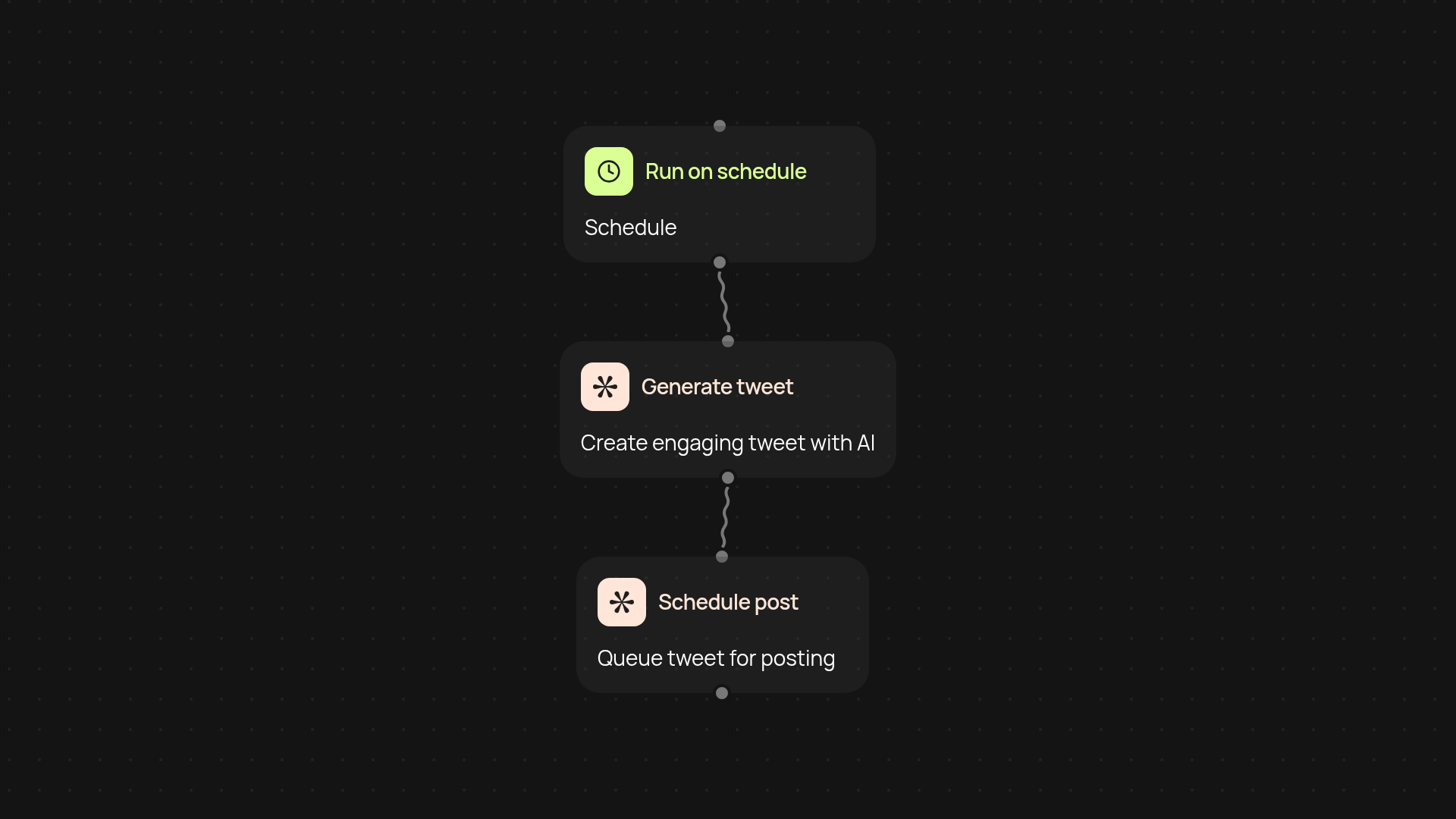 Just connect your Twitter account and set your preferred posting times. Share your content themes and let CodeWords handle the rest—AI generates tweets, and they're scheduled for you. No technical setup required—just a few clicks to take your Twitter marketing to the next level.