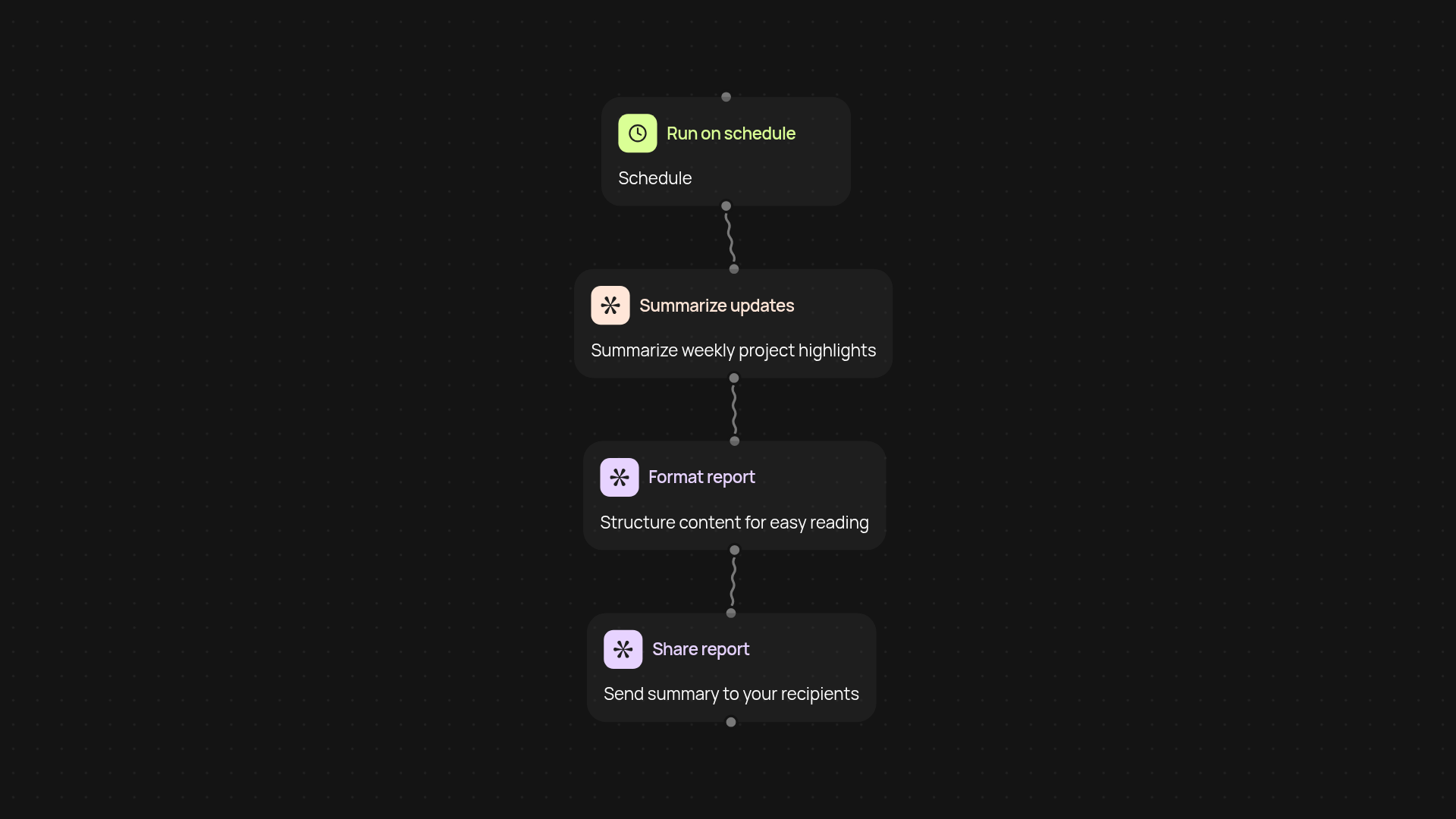 The weekly report generator turns your scattered project updates into structured weekly status reports. All you need to do is set it on autopilot — it instantly pulls key highlights, compiles them into a clear summary, and sends out your report. No more copy-pasting or chasing teammates for updates. Instead, you get a professional-looking summary every week, without lifting a finger.