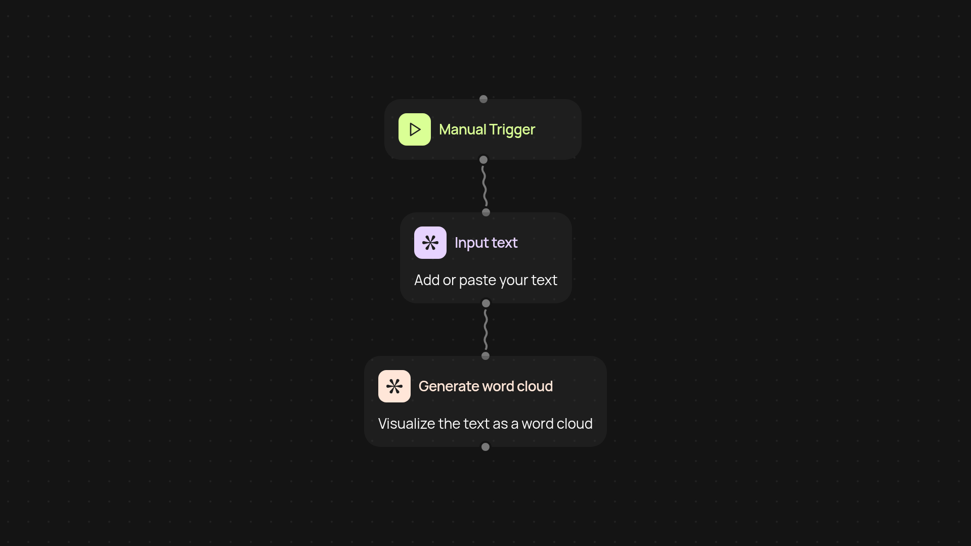 To set up your word cloud workflow, all you need is the text you want to visualize. The process starts with a trigger — you can run it manually whenever you want to summarize something new. The engine does the rest in the background, giving you a ready-to-use image. No special skills required; just bring your text and go from words to insight hands-free.