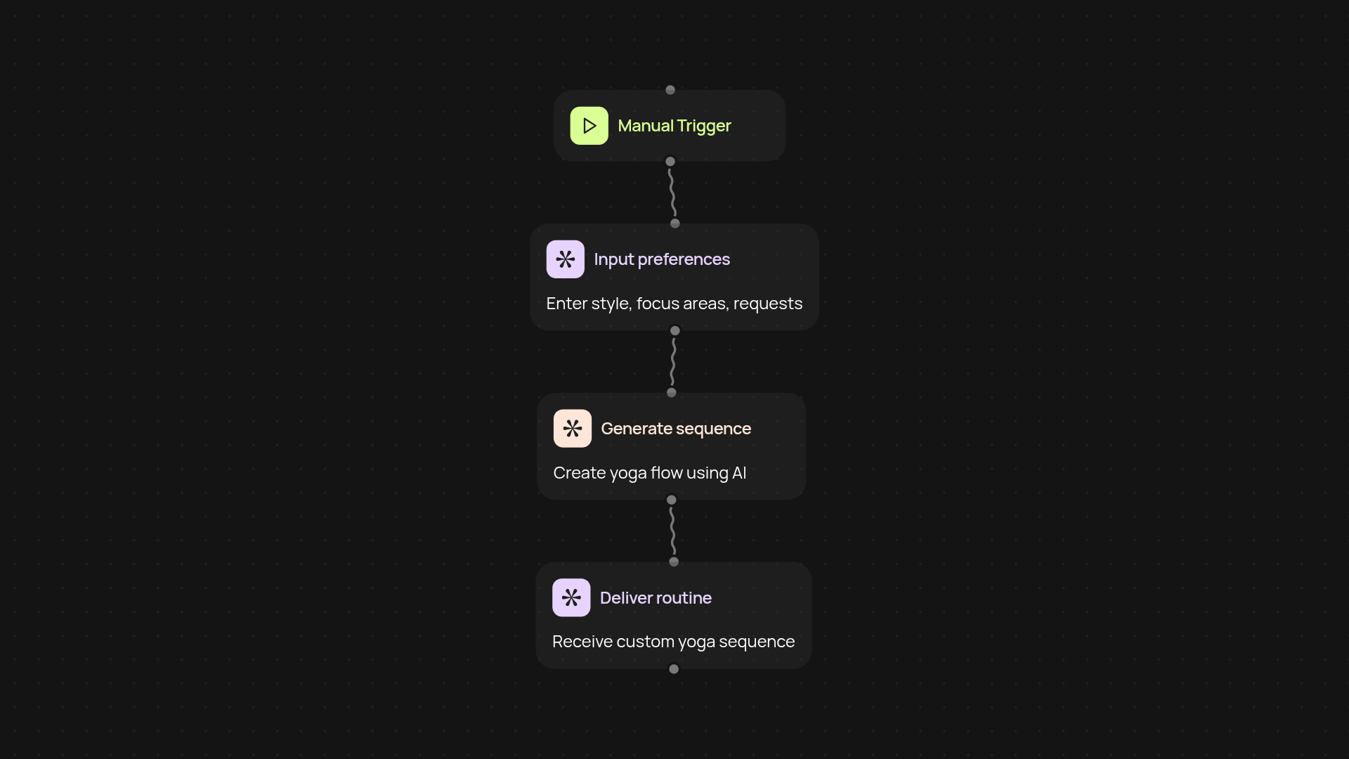 It’s simple. Begin by triggering the template and provide your sequence preferences—like the style of yoga or areas of focus. No setup expertise needed. All you need is your list of requirements. Within moments, your personalized sequence is ready to use for teaching, sharing, or practice.