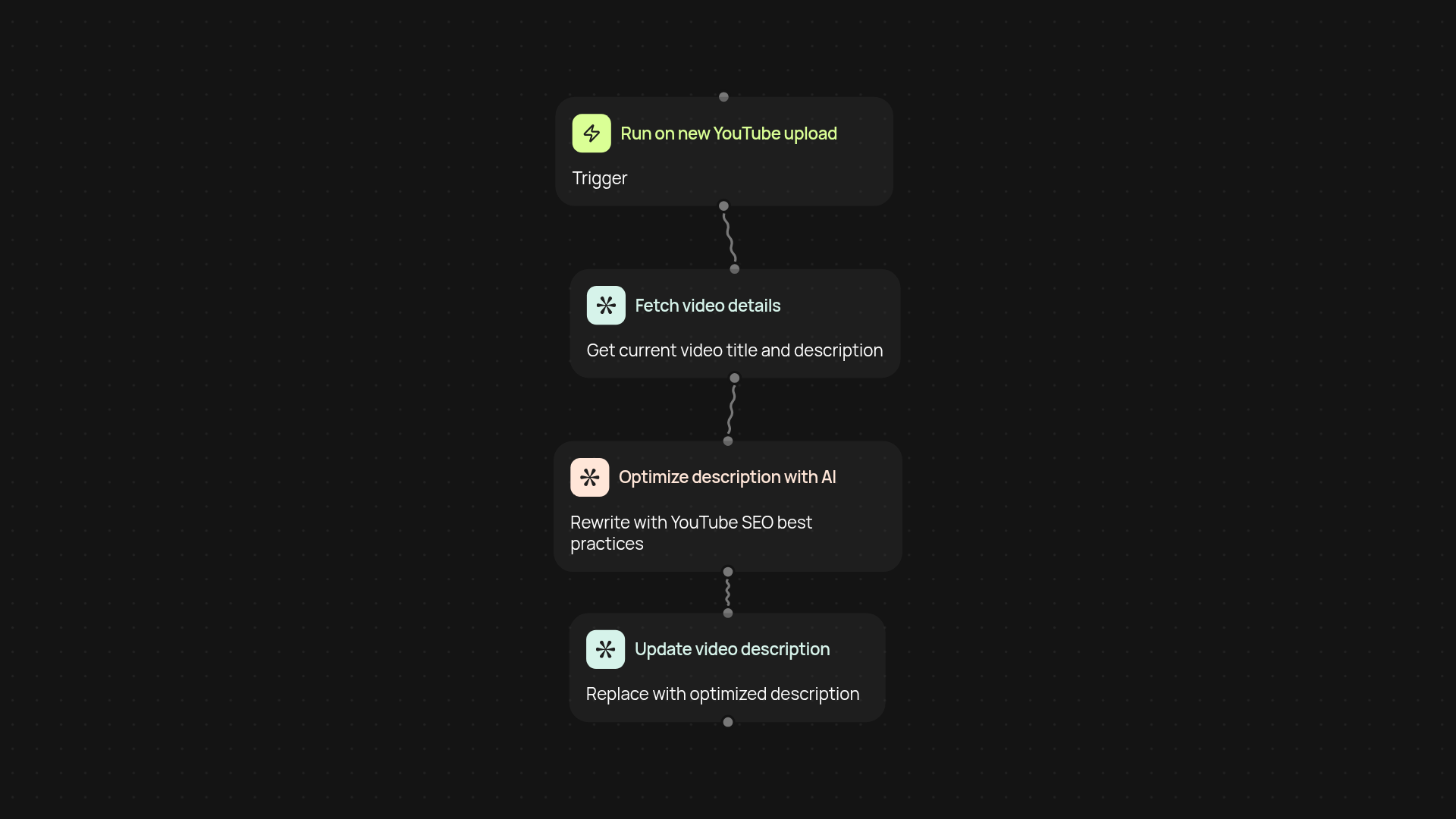 To start, just connect your YouTube account and decide which videos you want optimized. No technical setup — you’ll be guided every step of the way. Adjust your description preferences, then let the optimizer run on schedule or trigger it whenever you upload a new video. You’ll see upgraded descriptions with no extra effort.
