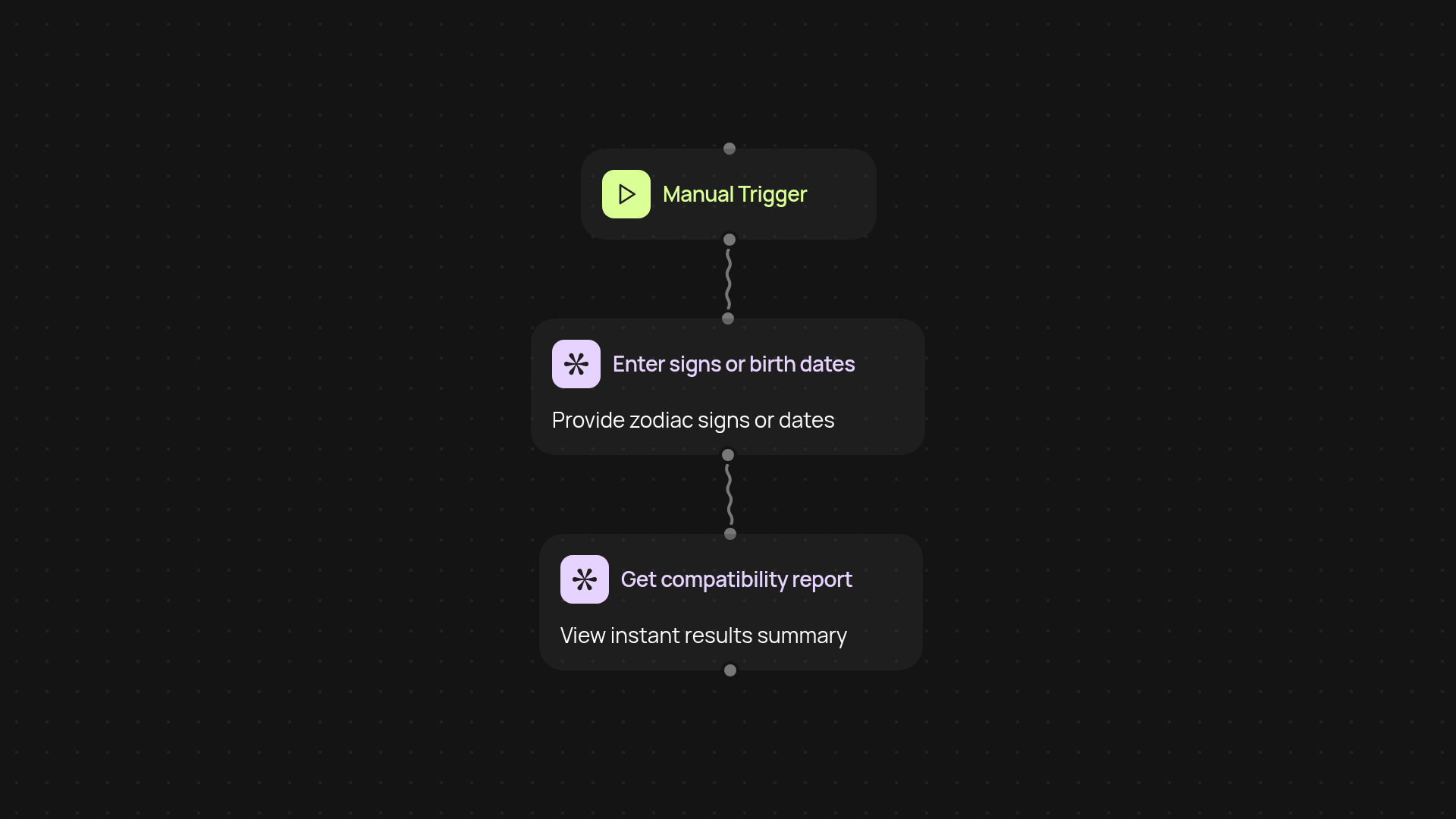 Setup takes only a few clicks. All you need are the two zodiac signs or relevant birth dates. The rest is automatic. Just click start, and your compatibility check is ready the moment you need it—no astrology expertise required.